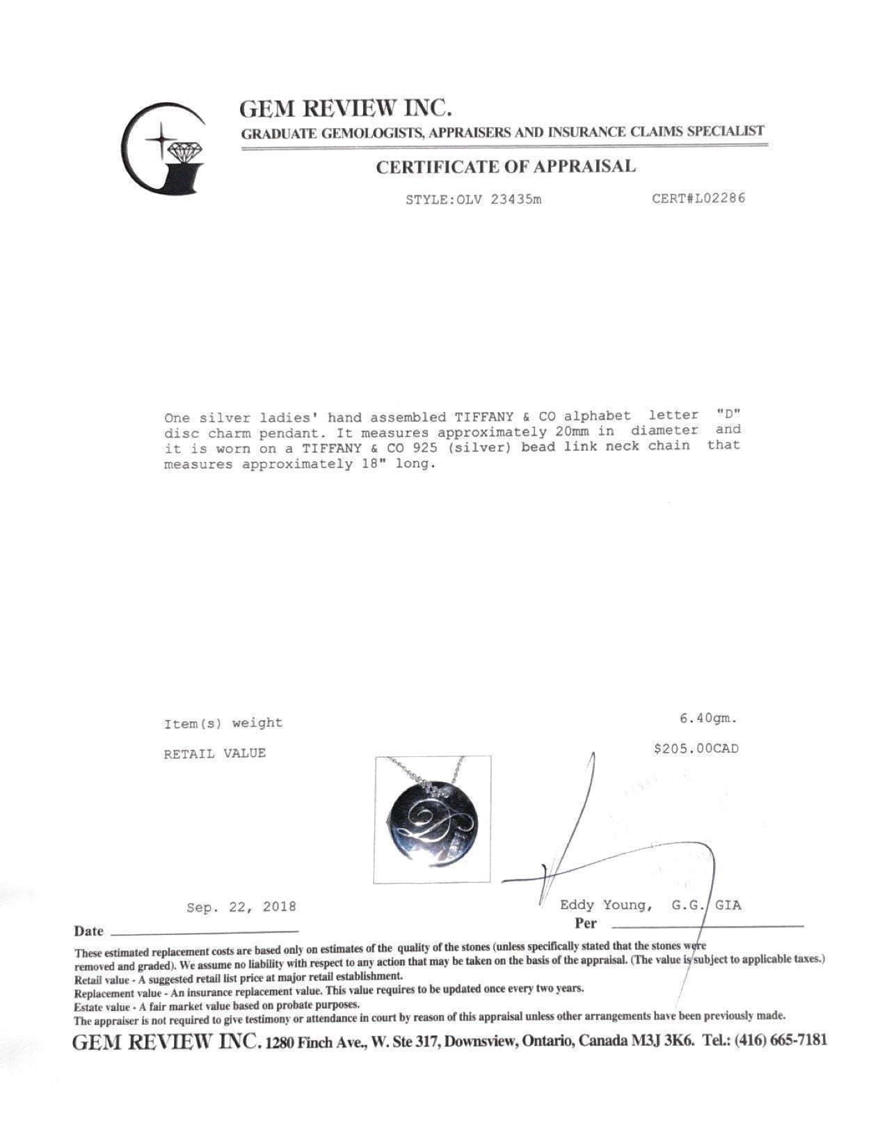 Tiffany & Co. Notes Letter 'D' Disc Charm Pendant Necklace