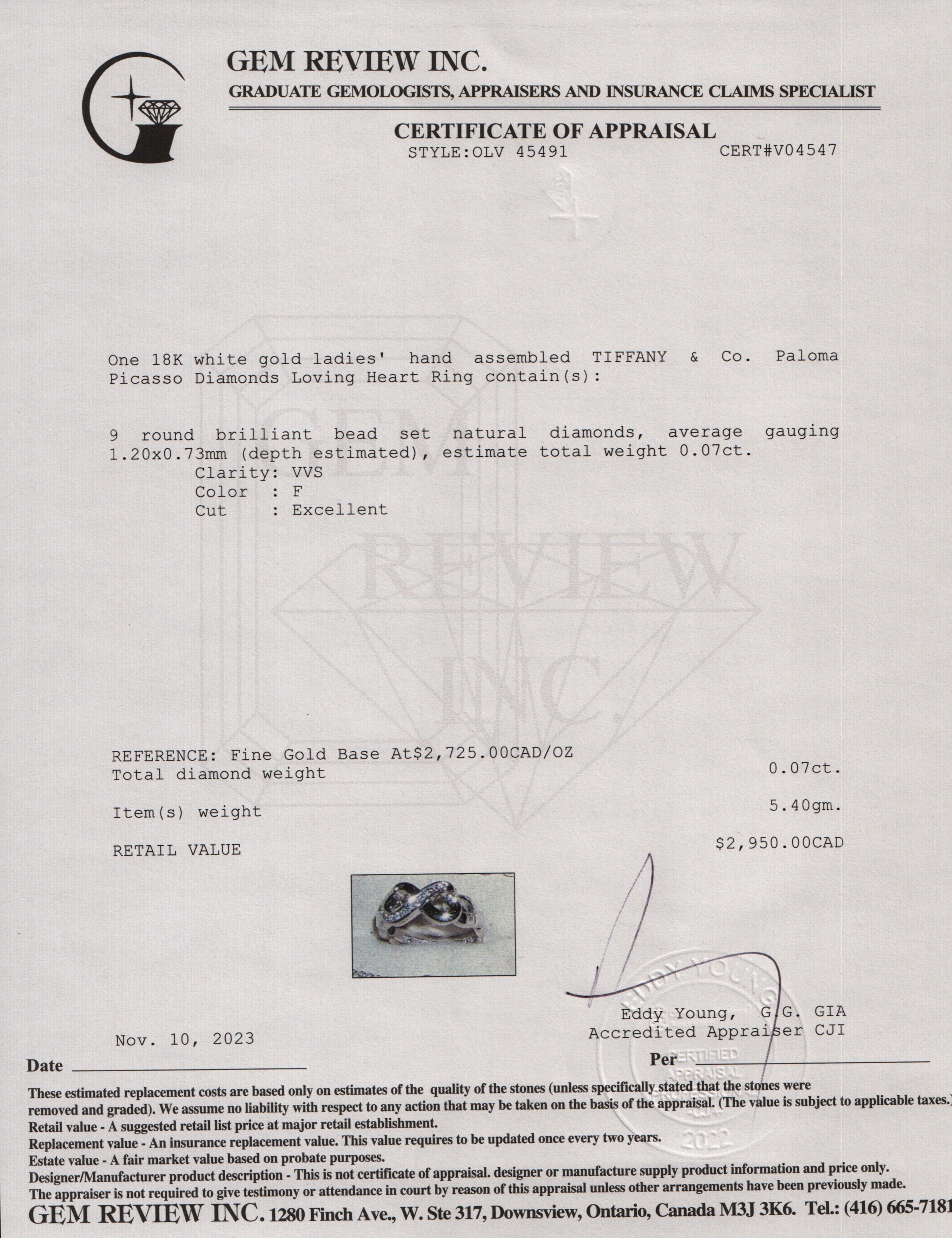 Paloma Picasso 18k White Gold Diamond Loving Heart Ring, Size 5 w/ Box & Receipt