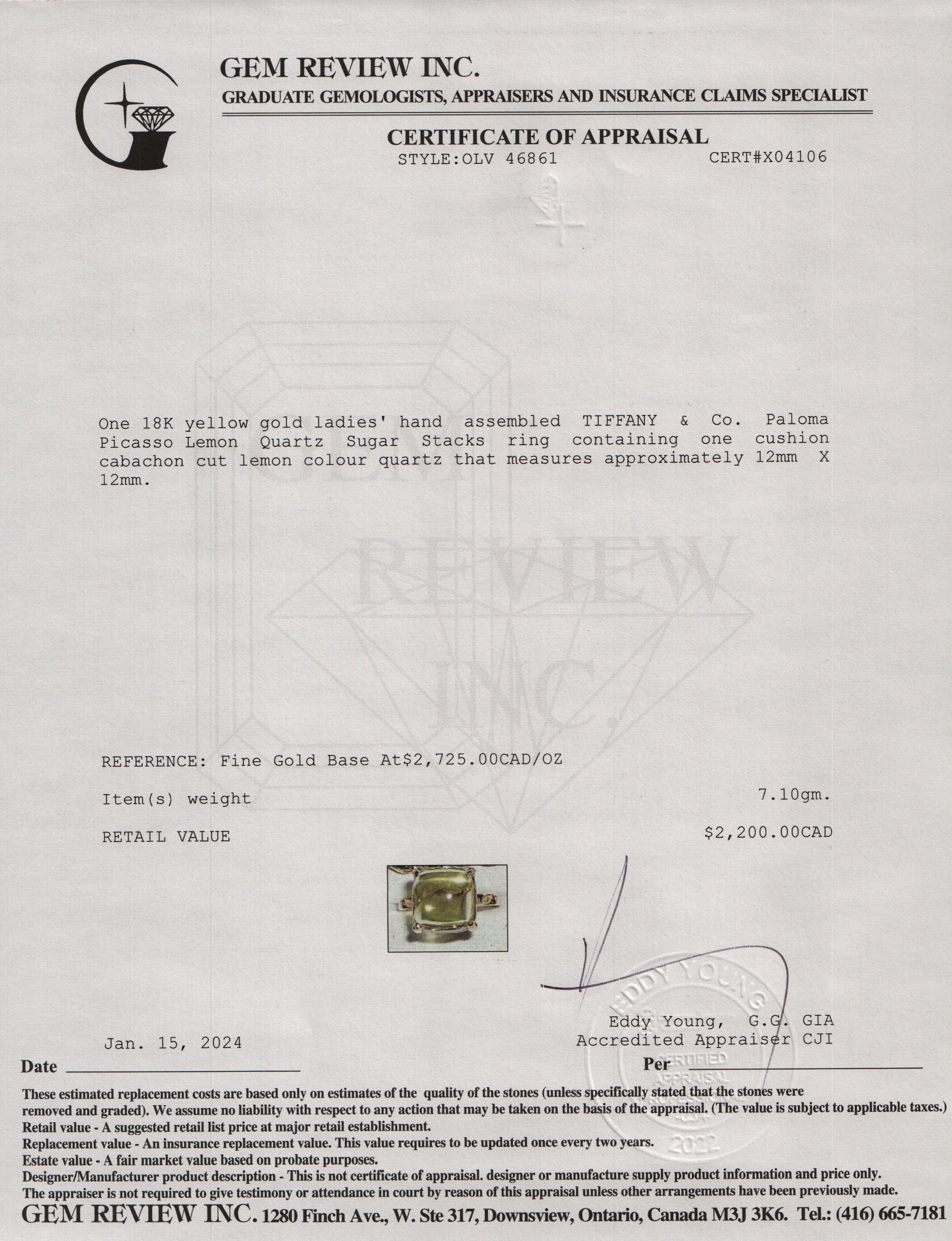 Paloma Picasso 18k Yellow Gold Lemon Quartz Sugar Stacks Ring, Size 7.5