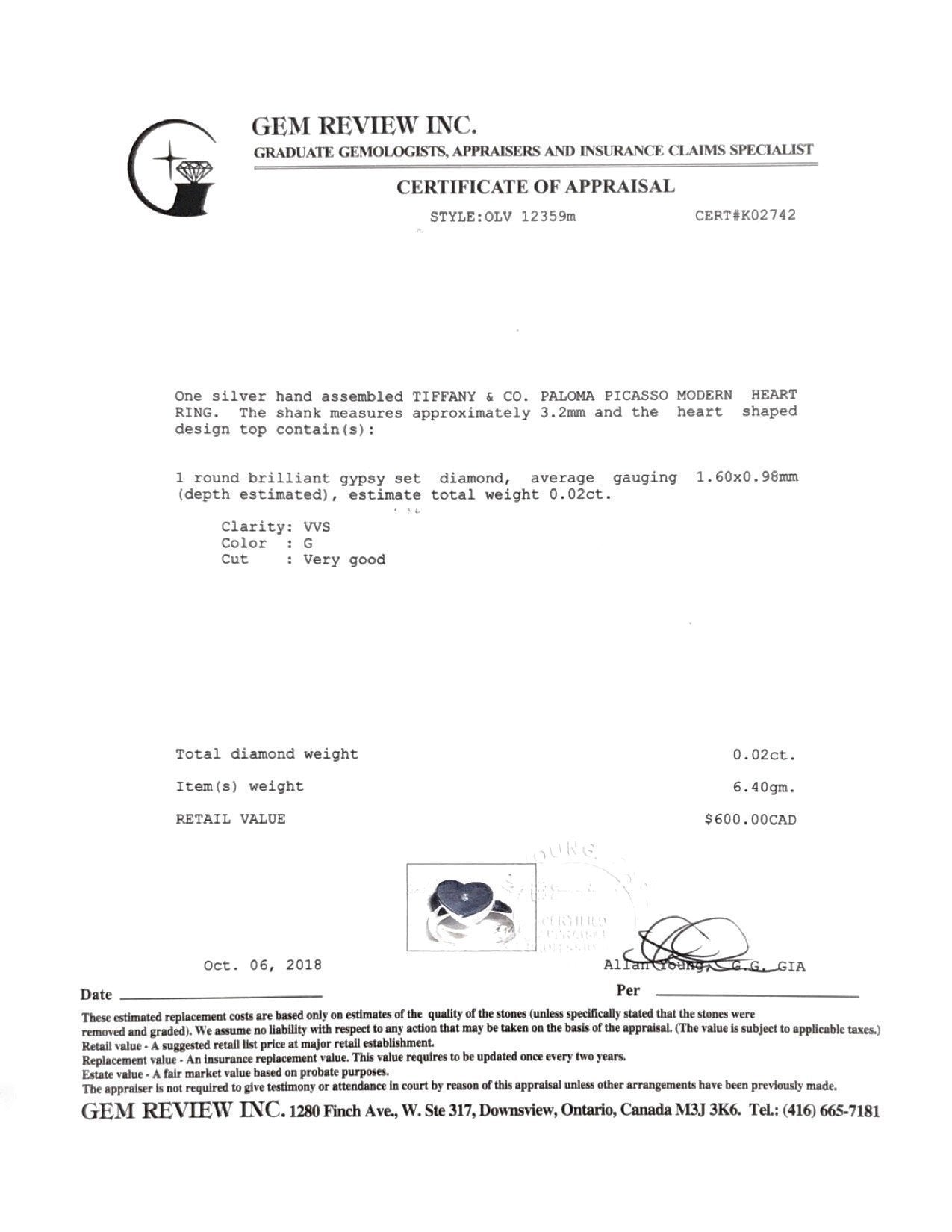 Tiffany & Co. Paloma Picasso Modern Heart Diamond Ring in Sterling Silver; Size 7