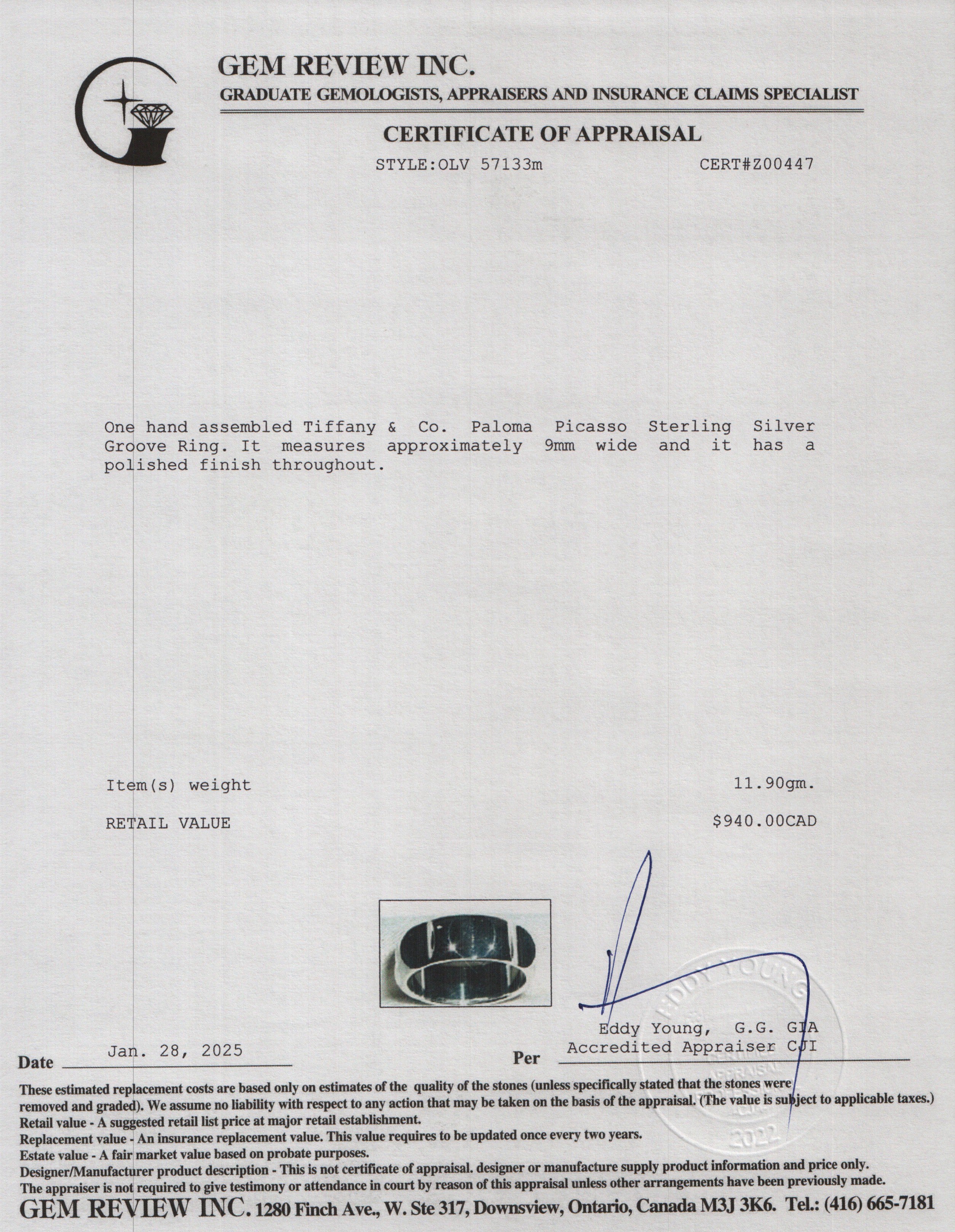 Paloma Picasso Sterling Silver Groove Ring, Size 9