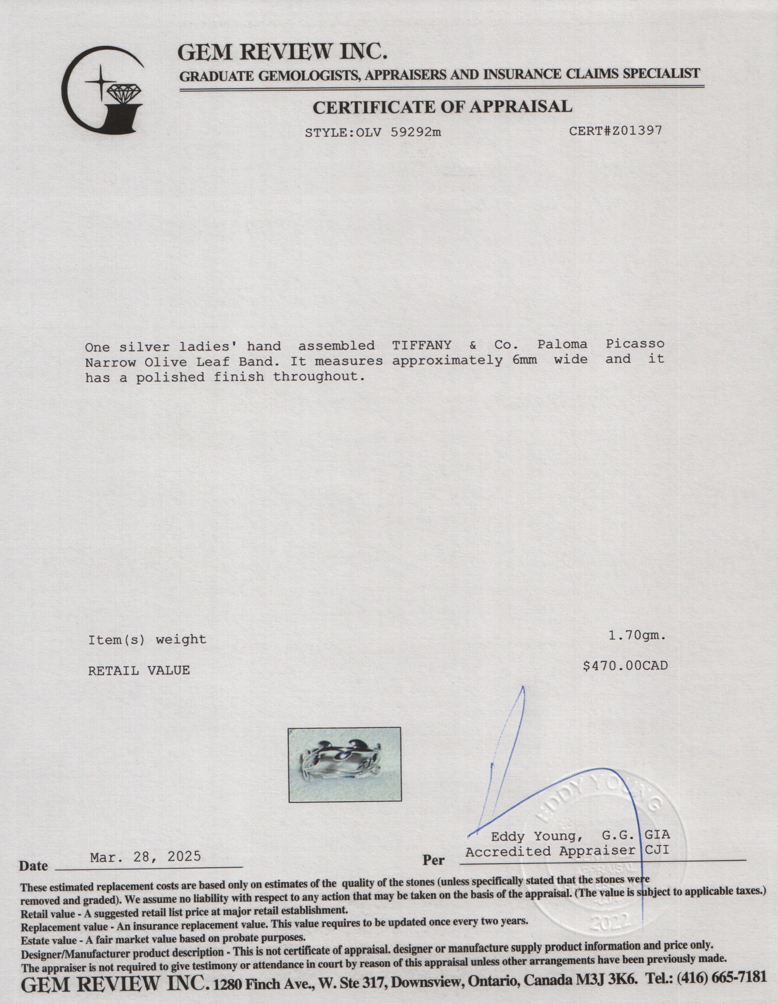 Paloma Picasso Sterling Silver Narrow Olive Leaf Band Ring, Size 5