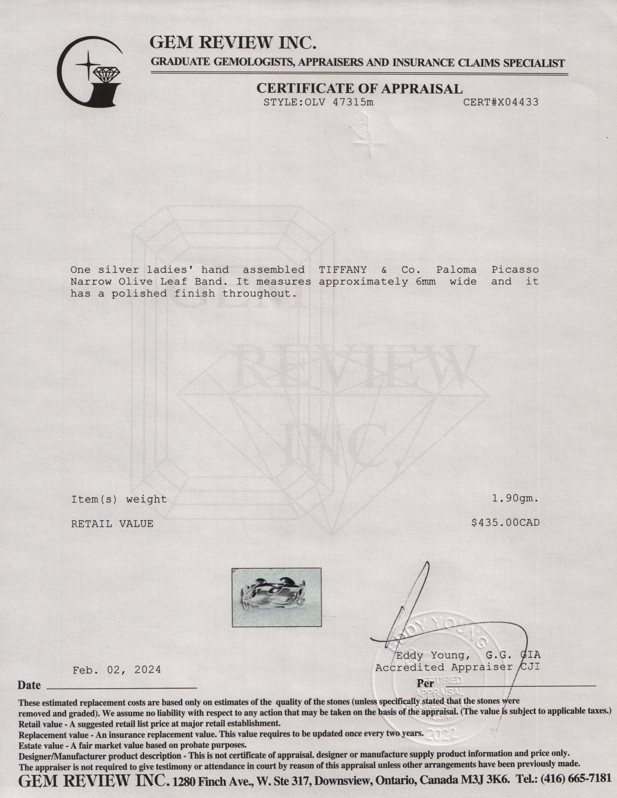 Paloma Picasso Sterling Silver Narrow Olive Leaf Band Ring, Size 7