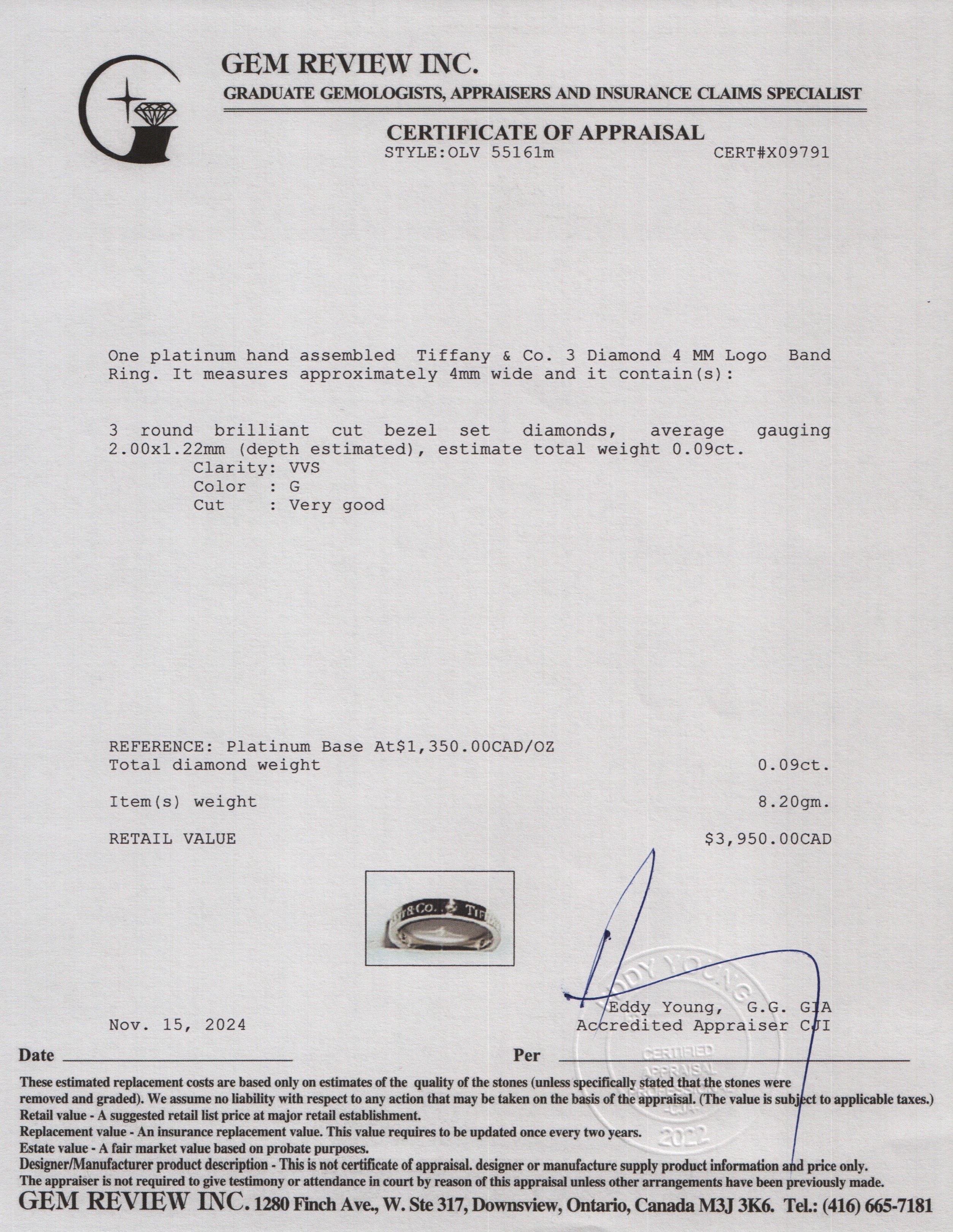 Platinum & 3 Diamond 4 MM Logo Band Ring, Size 9.25 w/ Box