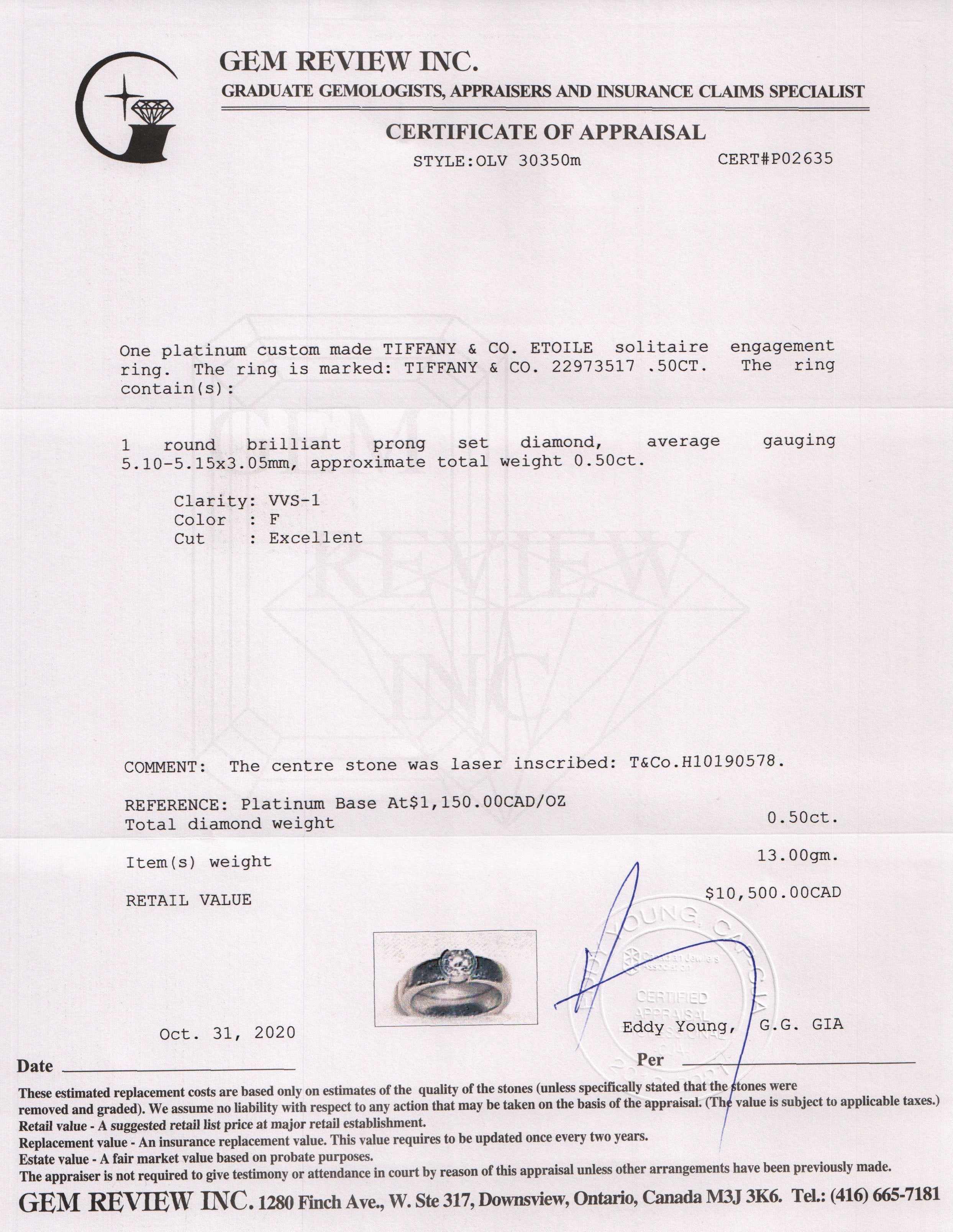 - Signature/Hallmarks: Tiffany & Co. Pt950 22973517 .50 CT. Diamond Laser Inscribed: T & Co. H10190578