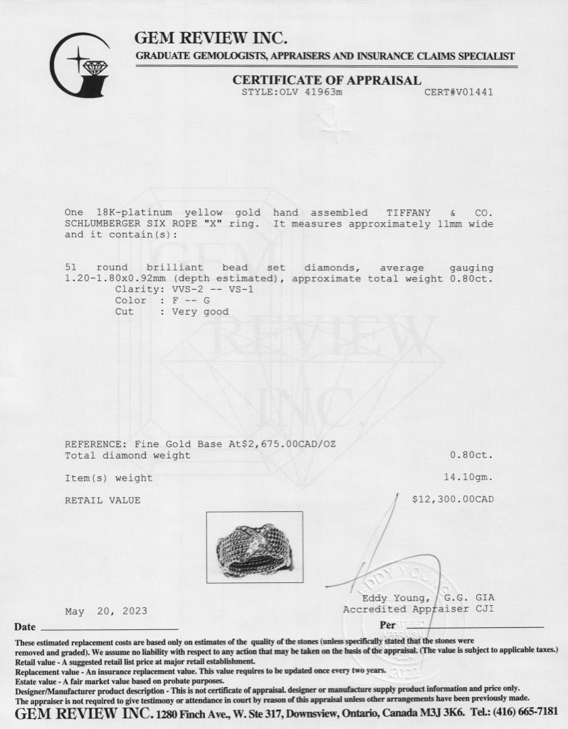 Tiffany & Co. Schlumberger 18k Gold & Platinum Rope Six-Row Diamond "X" Ring