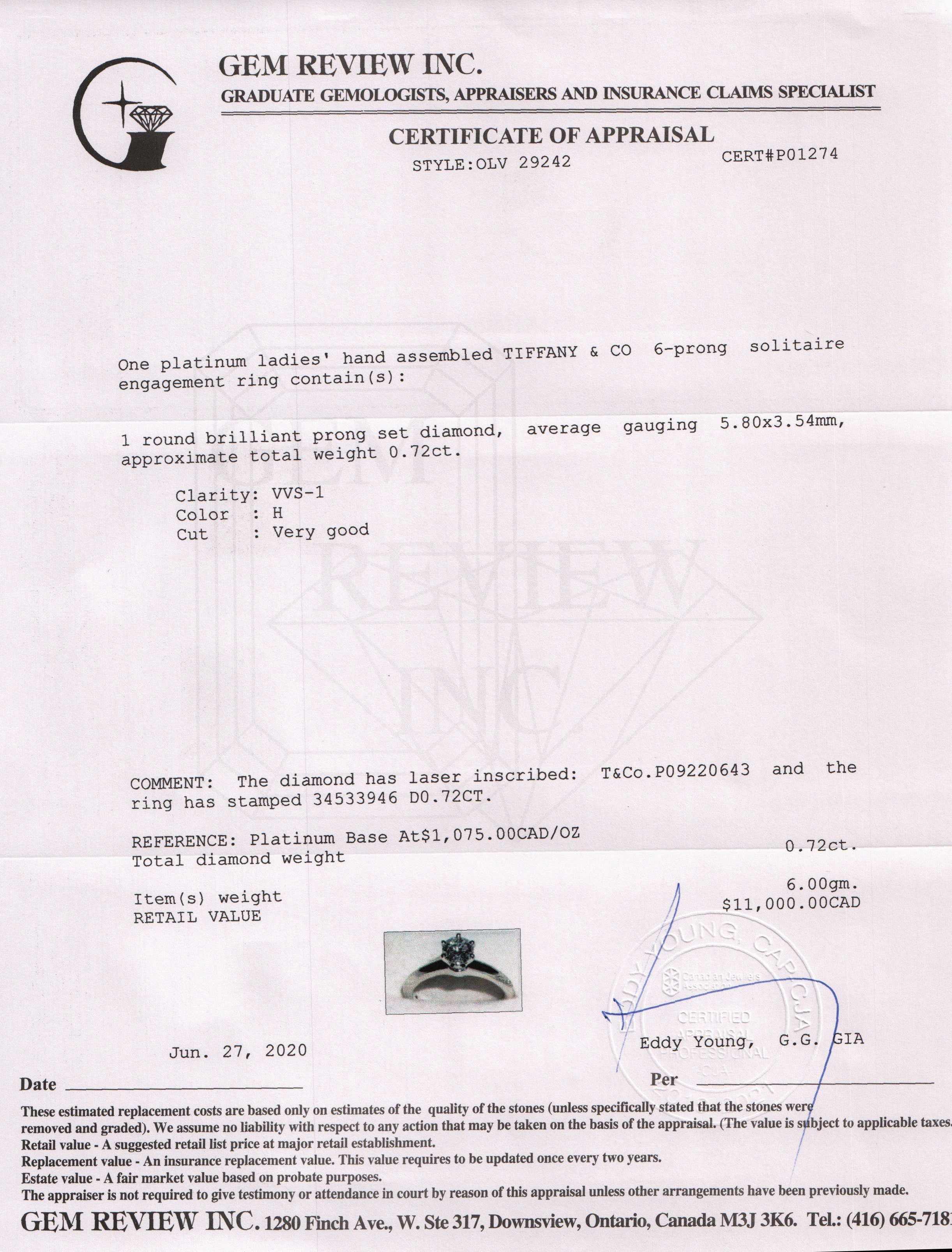Tiffany & Co. Solitaire 0.72 ct. Round Diamond Engagement Ring