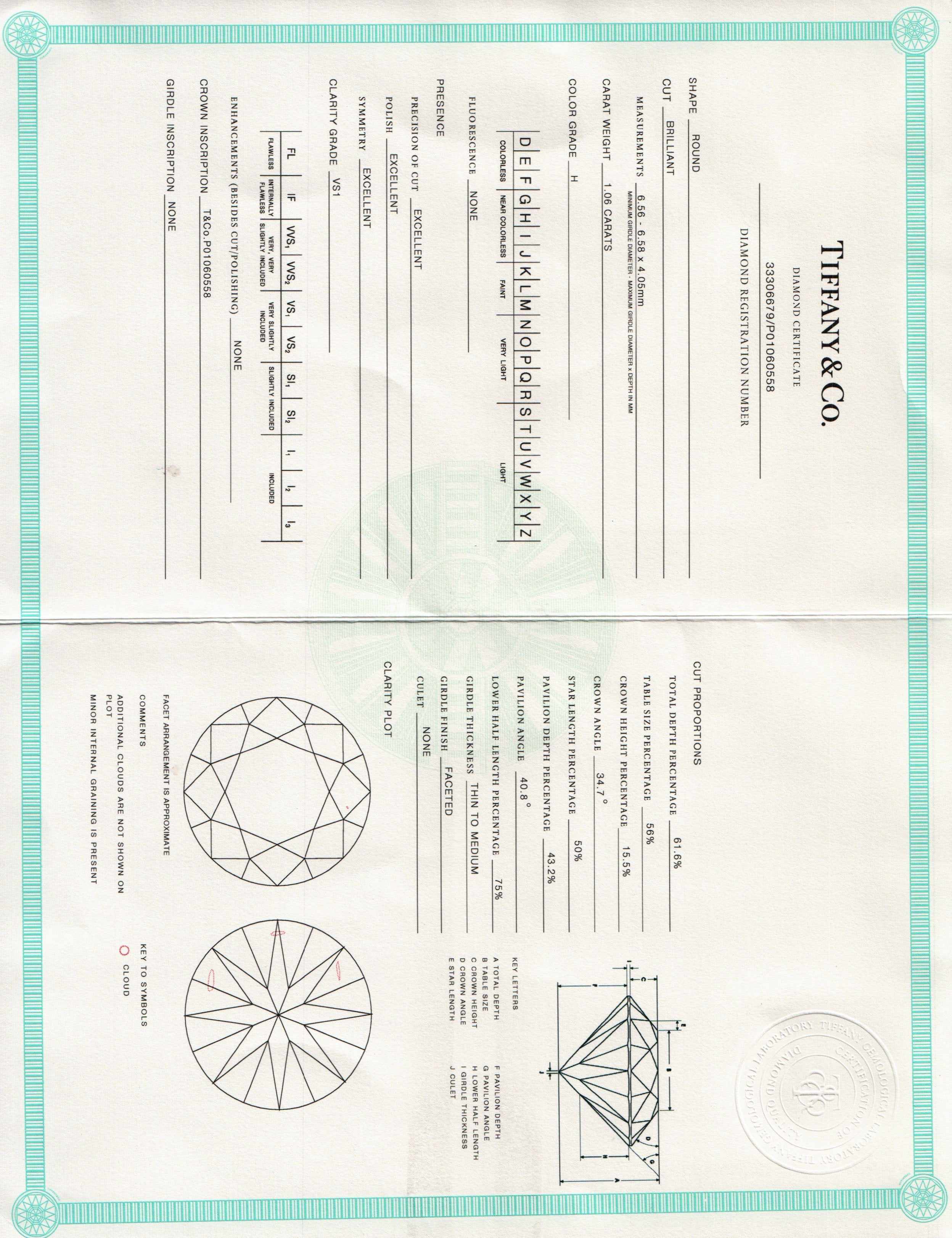 Included Items: Original Tiffany & Co. Diamond Certificate & Gem Review Appraisal