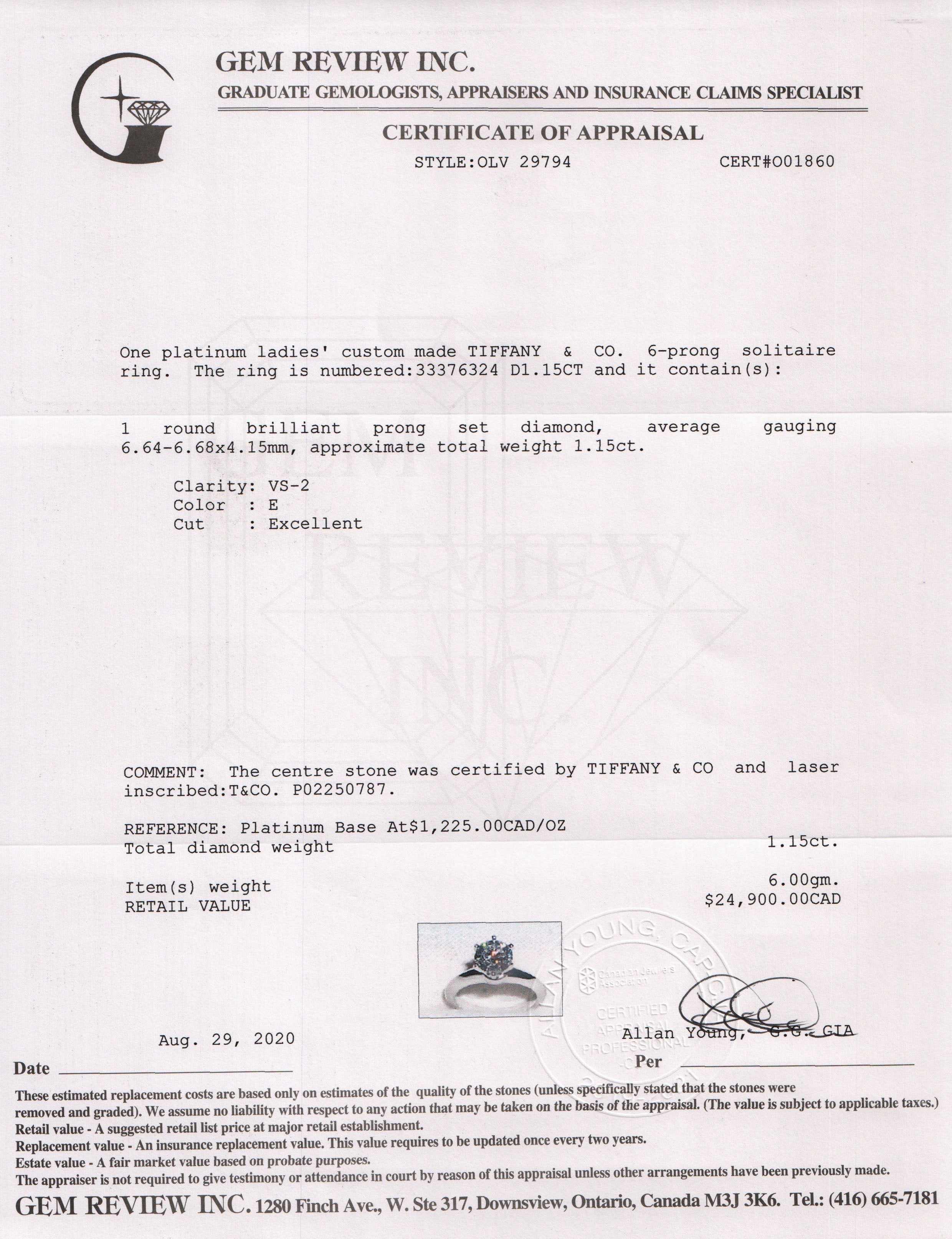 Included Items: Original Tiffany Diamond Certificate, Paperworks, Receipt and Gem Review Appraisal