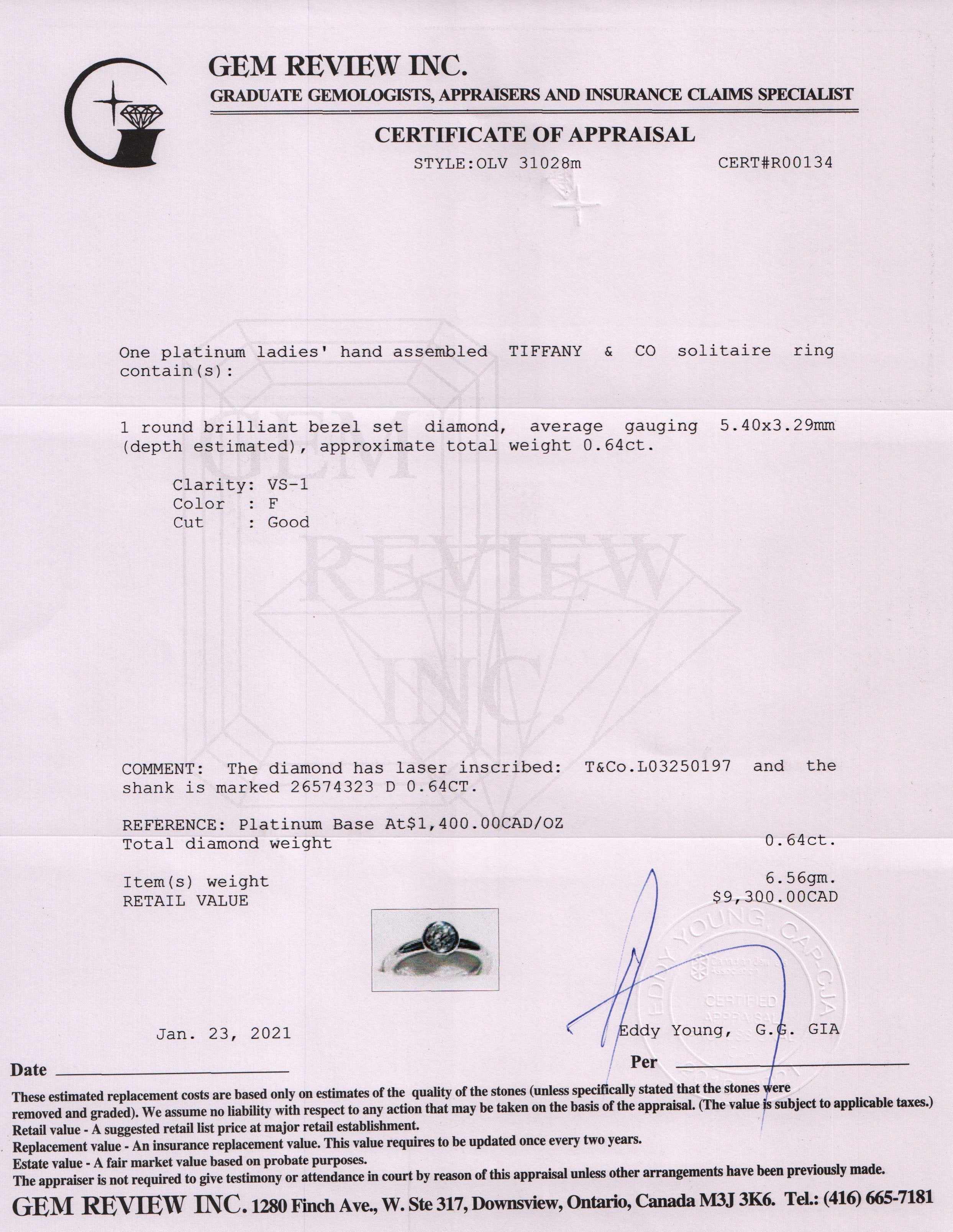 - Signature/Hallmarks: Tiffany & Co. PT950 26574323 D 0.64 CT