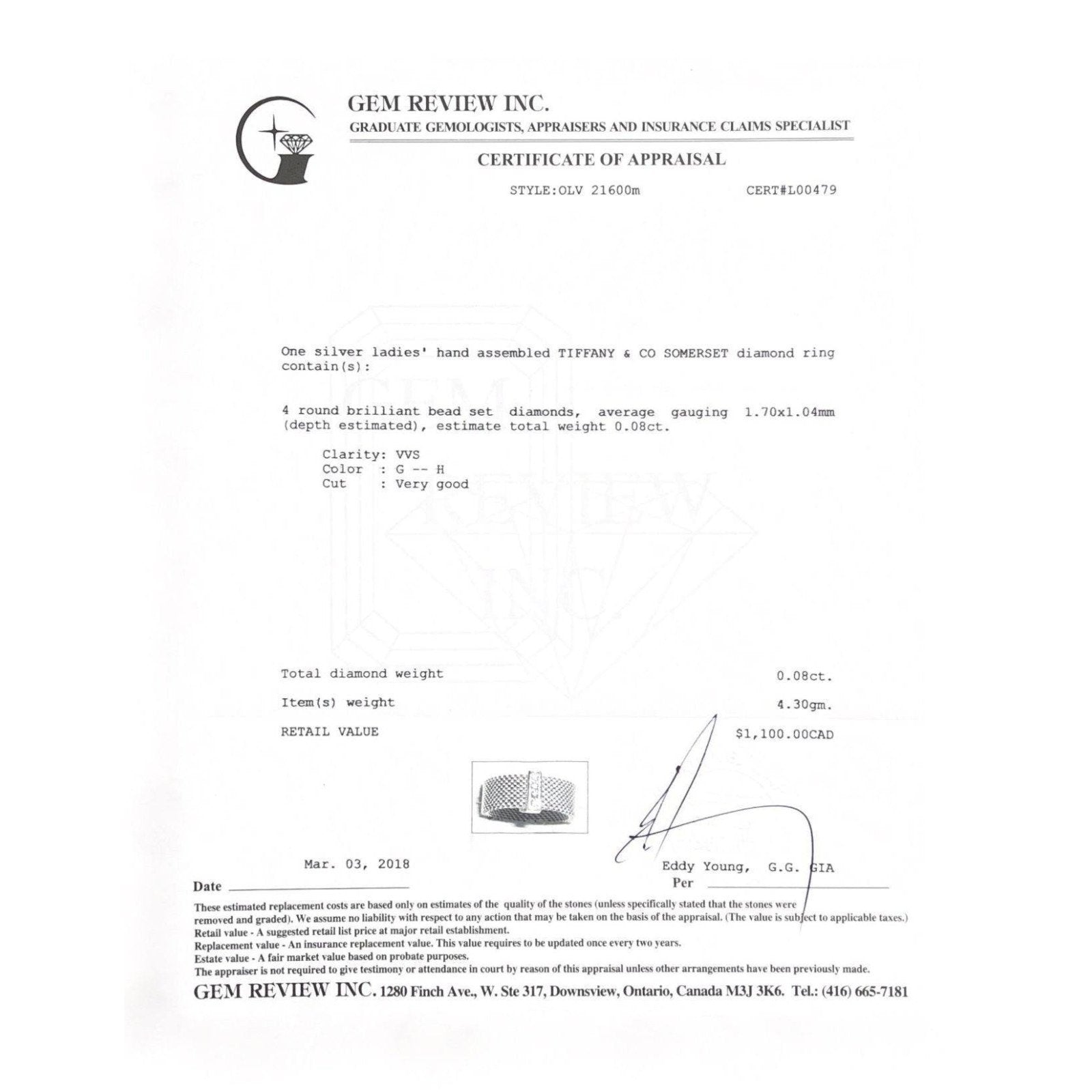 Tiffany & Co. Somerset Ring with Diamonds in Sterling Silver; Approximately 0.08 Total Diamond Carat Weight, VVS Clarity, G Colour; Size 6 1/2; Comes with Gem Review Appraisal