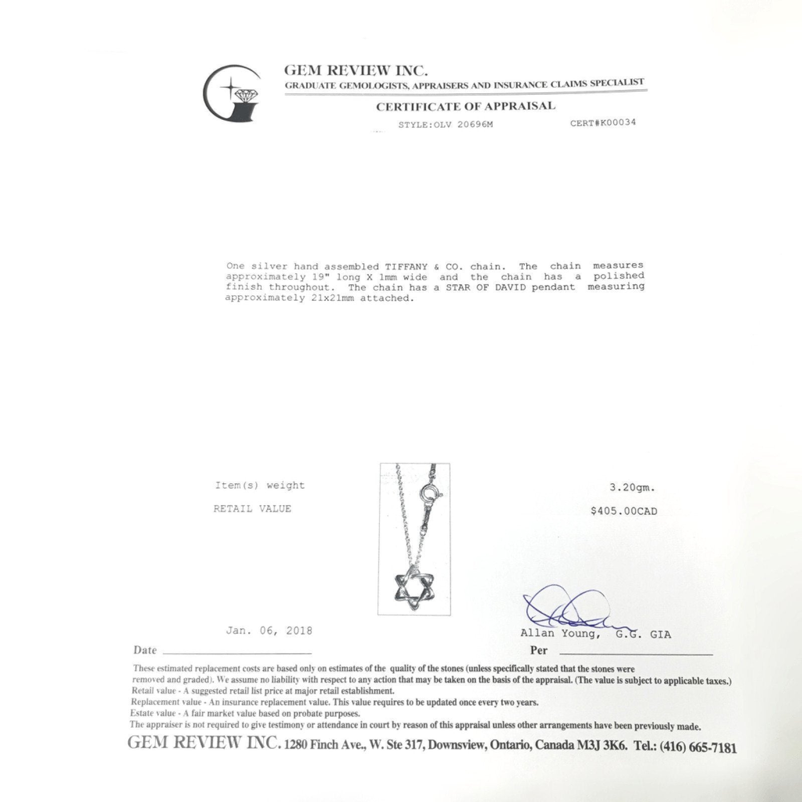 Tiffany & Co. Star of David Pendant on a 19.5” Chain in Sterling SIlver; Star of David Pendant, 22 mm Wide; Comes with Gem Review Appraisal