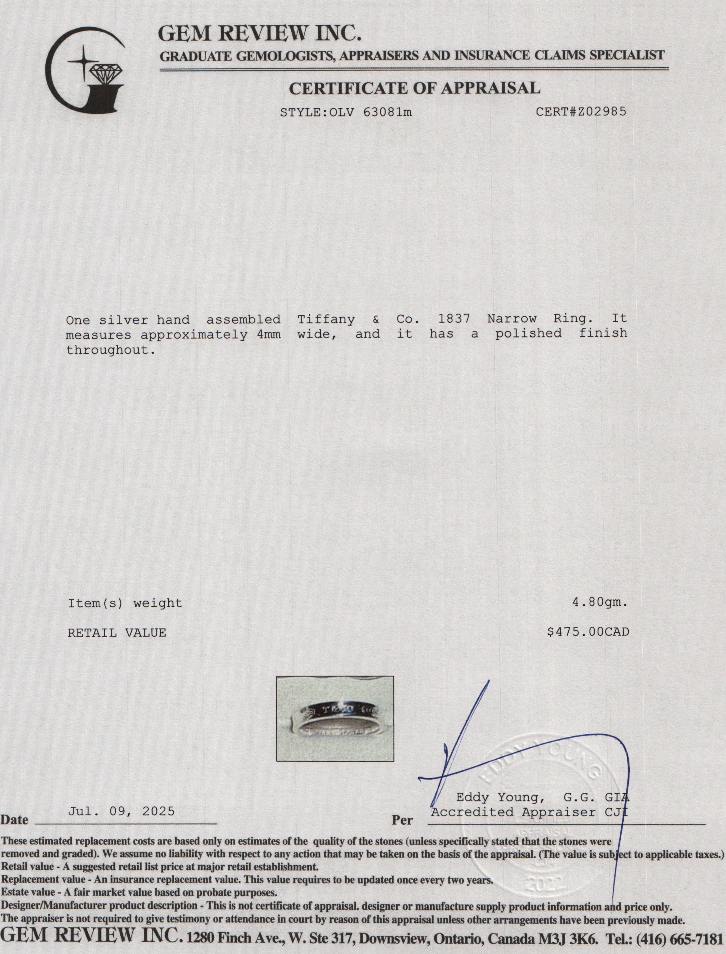 Sterling Silver 1837 Narrow Ring, Size 9.5