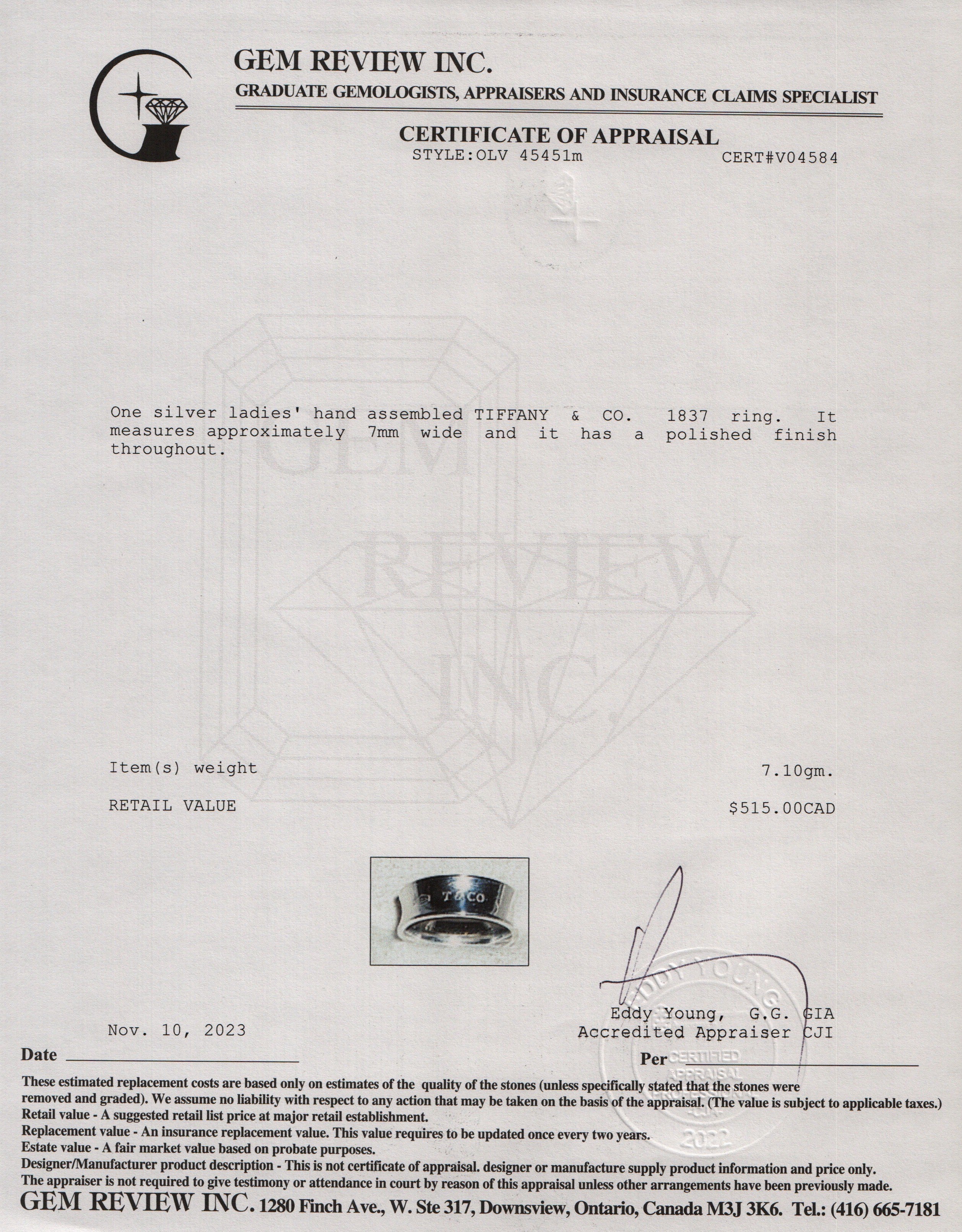 Sterling Silver 1837 Ring, Size 6