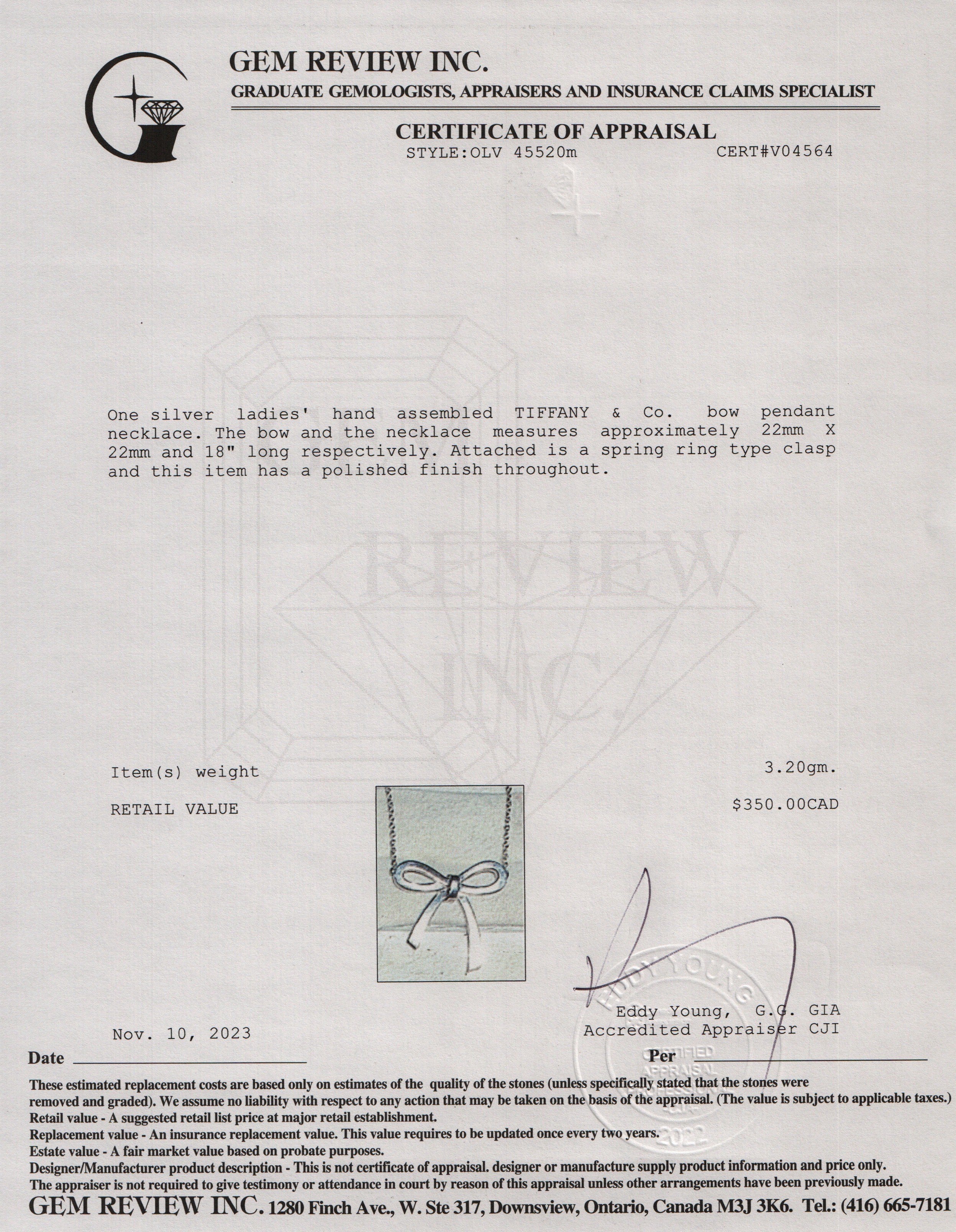 Chain Length 18.25", Bow Pendant 22 mm x 22 mm