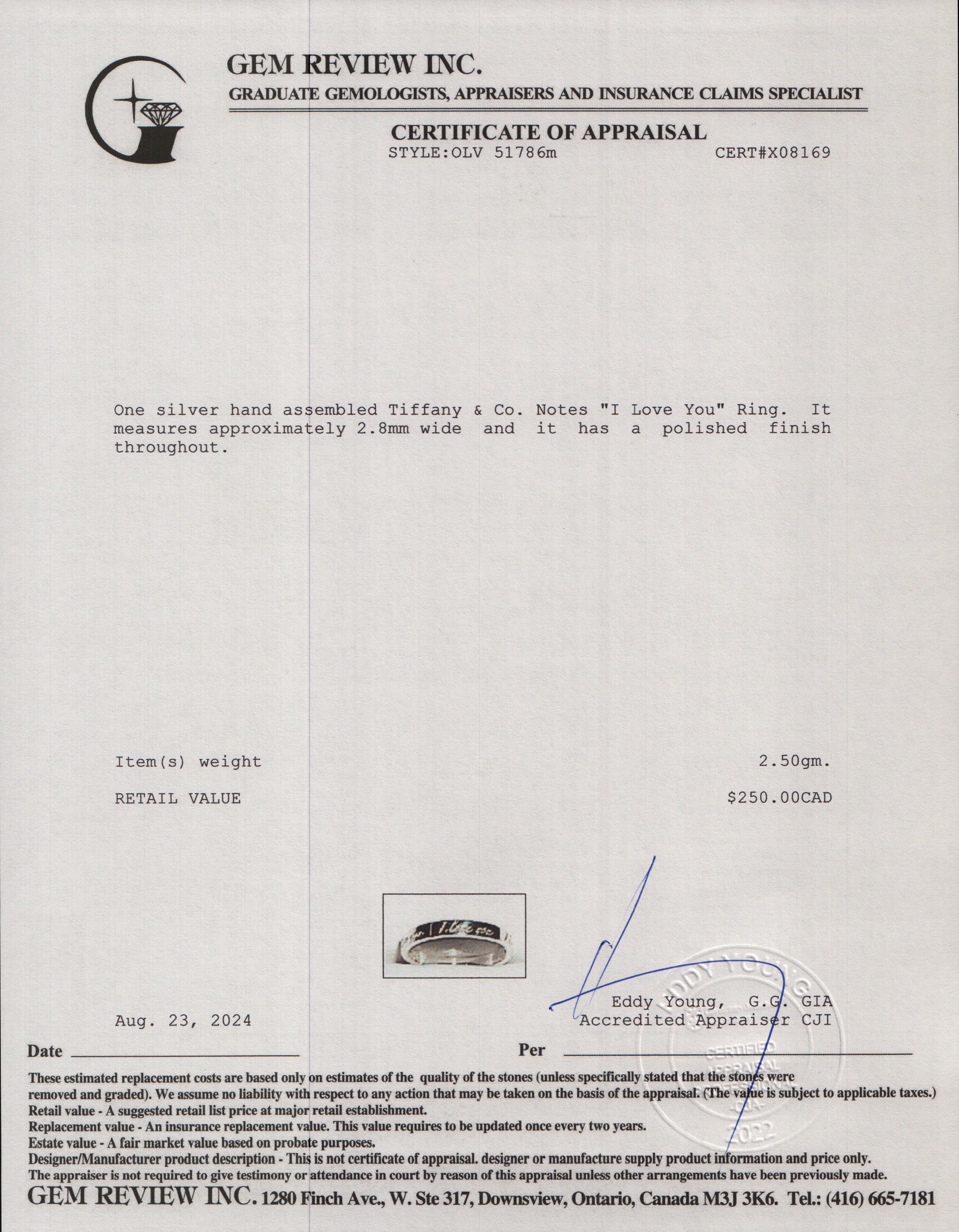 Sterling Silver Notes "I Love You" Ring, Size 6