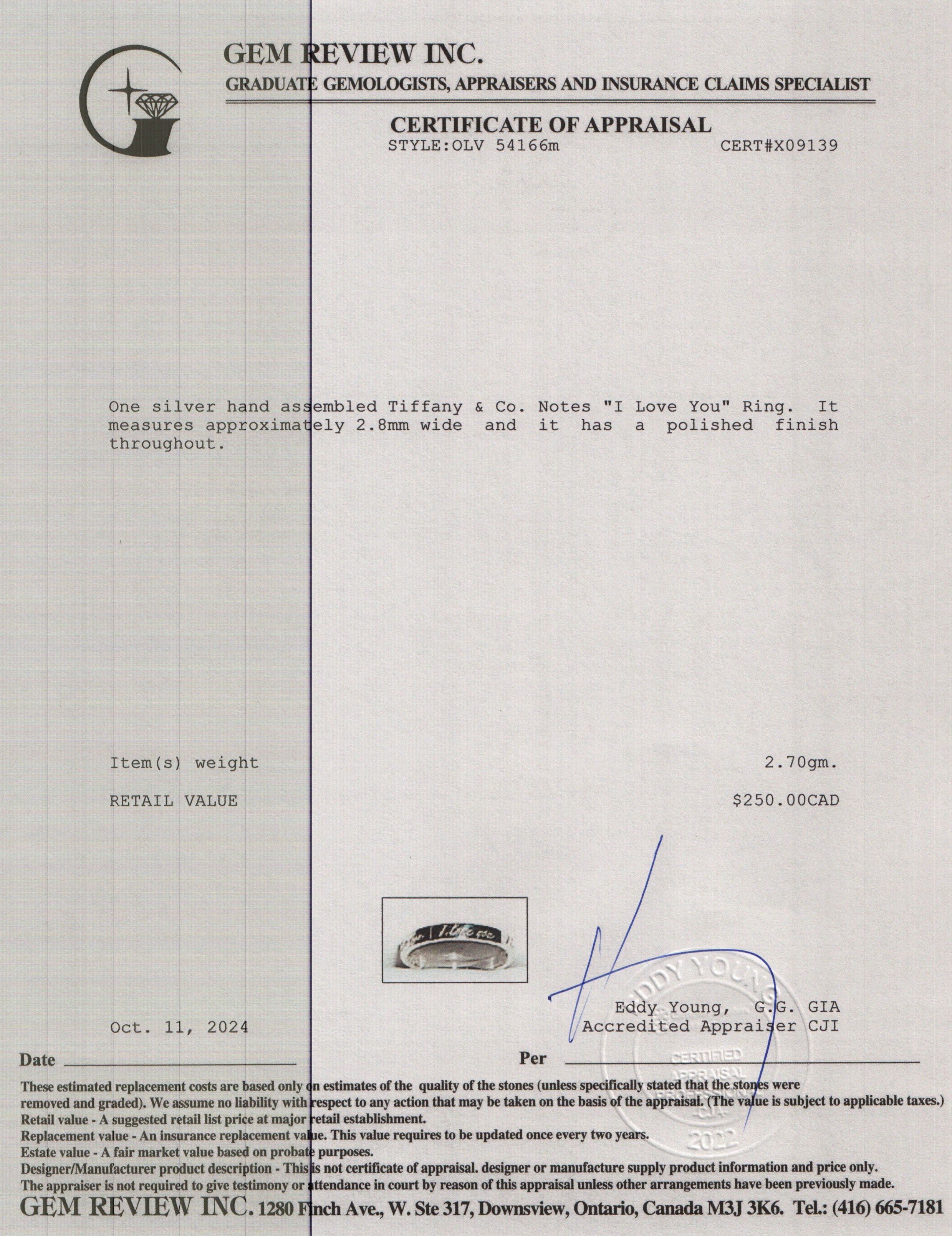 Sterling Silver Notes "I Love You" Ring, Size 7