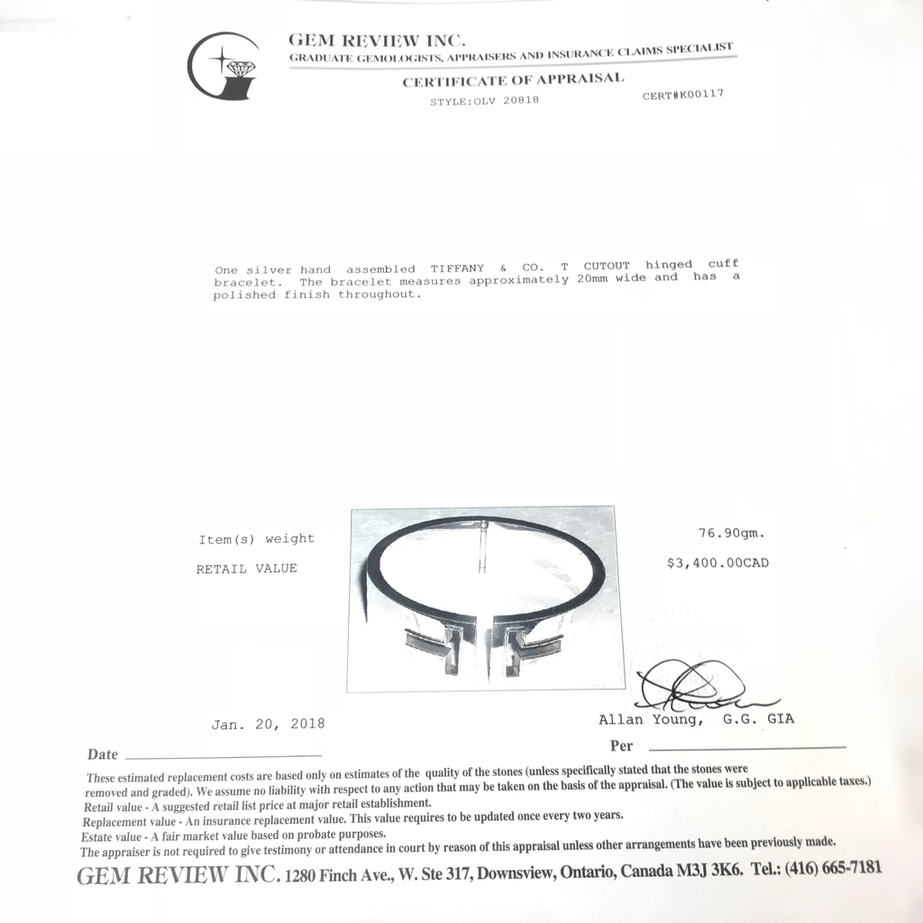 Tiffany & Co. T Cutout Hinged Cuff Bracelet Set In Sterling Silver; Comes With Gem Review Appraisal.