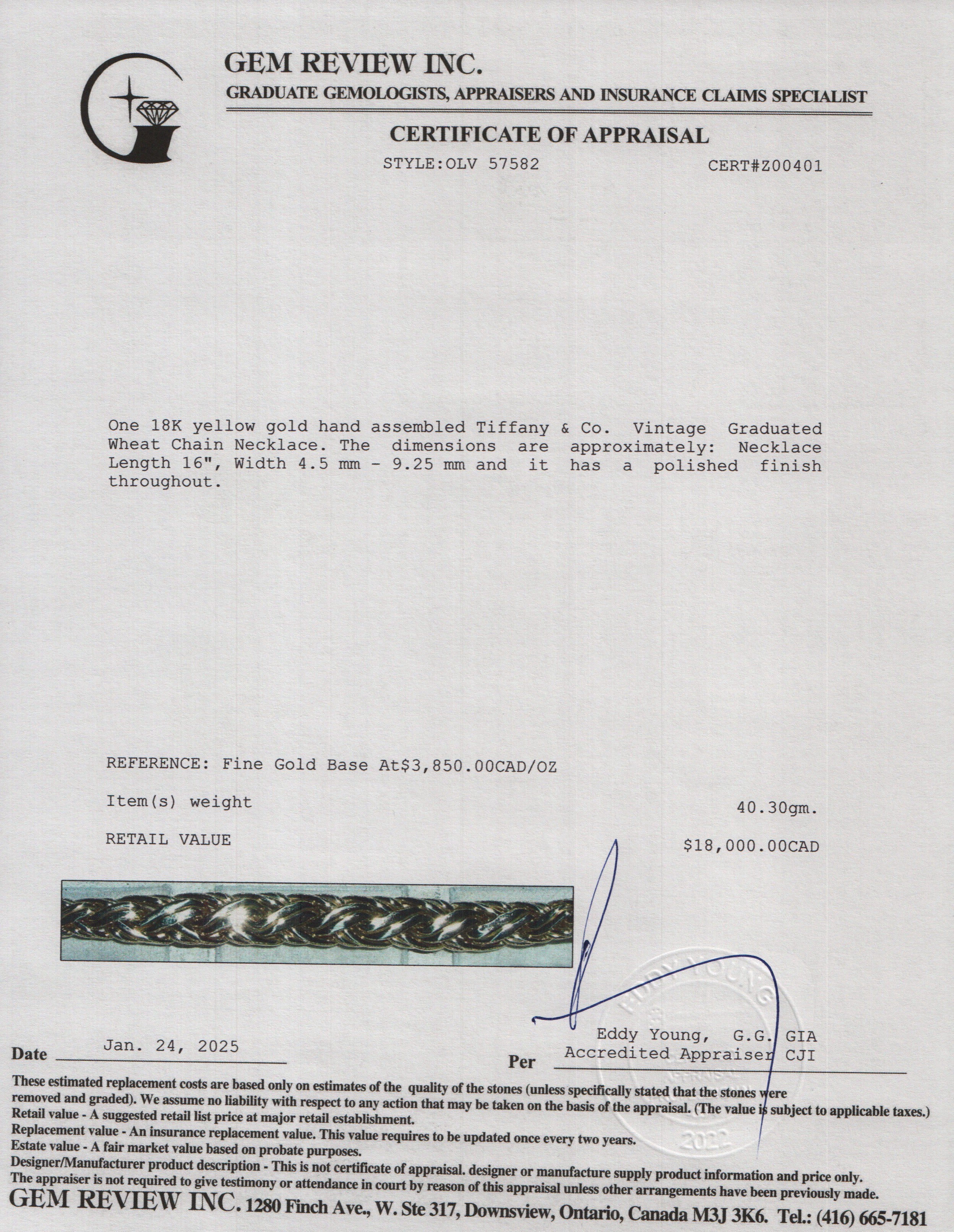 Vintage 18k Yellow Gold Graduated Wheat Chain Necklace w/ Box