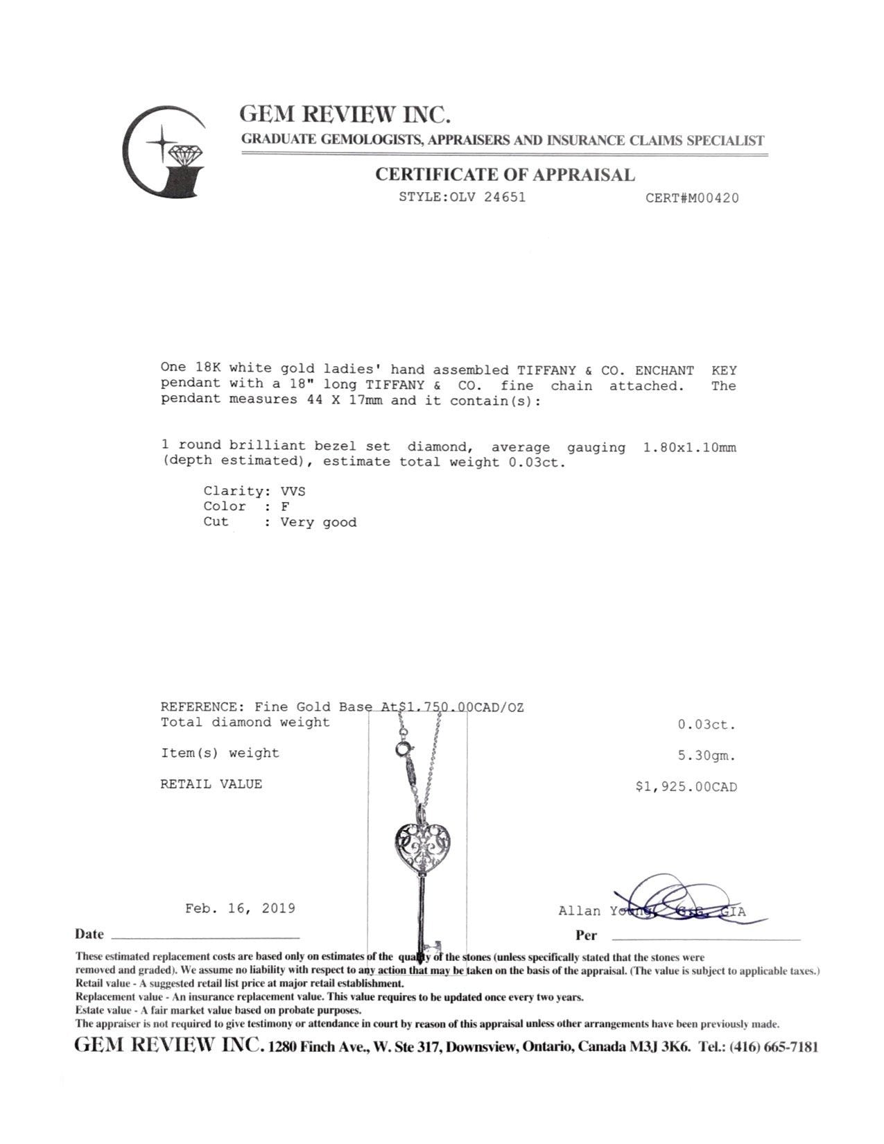 Tiffany & Co. White Gold Enchant Heart Key Pendant Necklace with Diamond