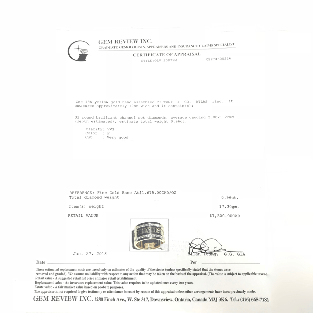 Tiffany Wide Atlas Ring in 18kt Yellow Gold; Approximately 0.96 Total Diamond Carat Weight, VVS Clarity, F Colour; 12mm Wide; Size 8; Comes with Gem Review Appraisal