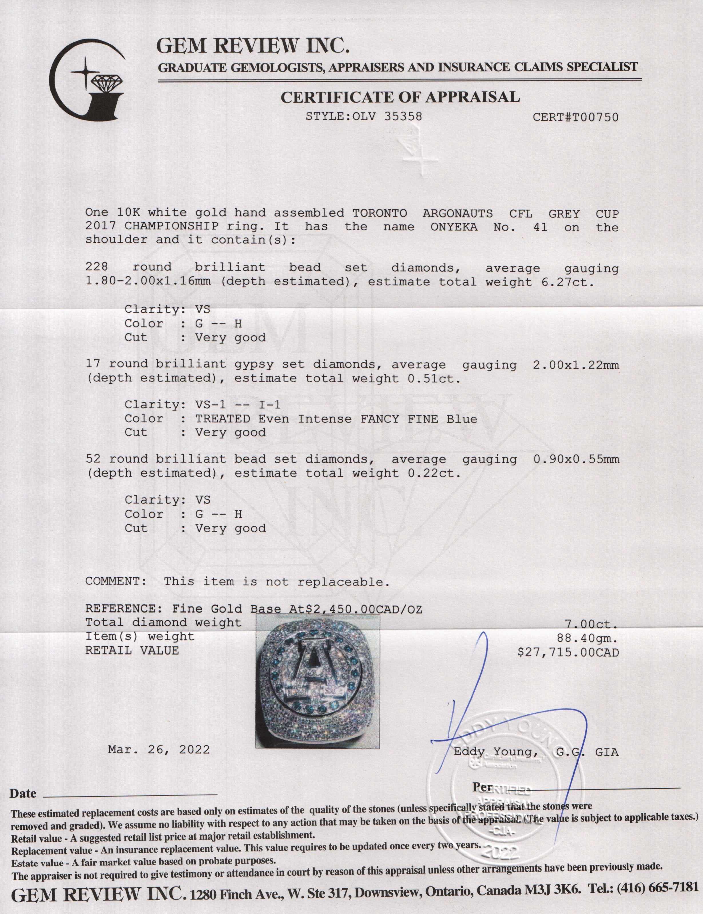 Toronto Argonauts CFL Grey Cup 2017 Championship Diamond Ring