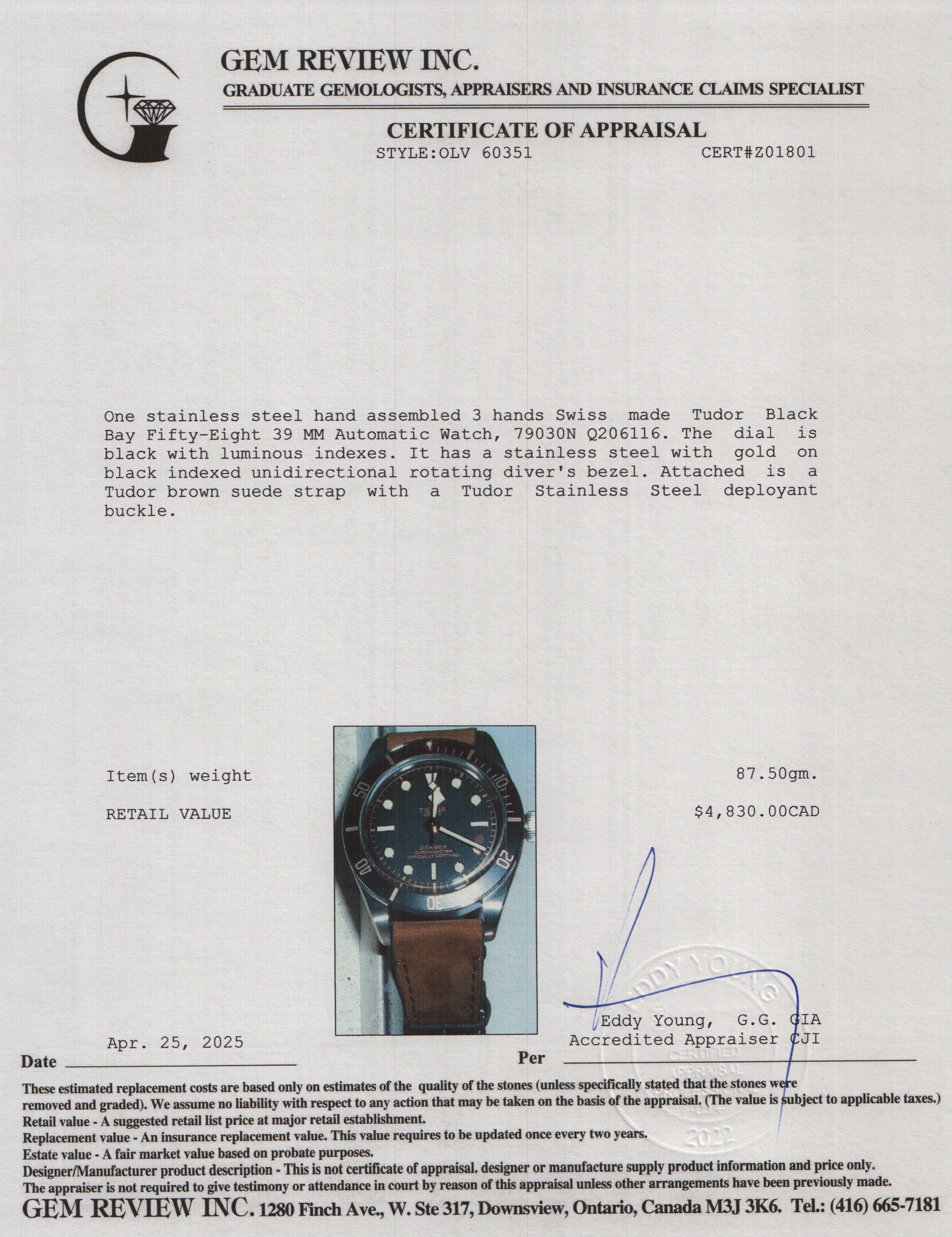 Stainless Steel Black Bay Fifty-Eight 39 MM Automatic Watch 79030N w/ Box & Papers