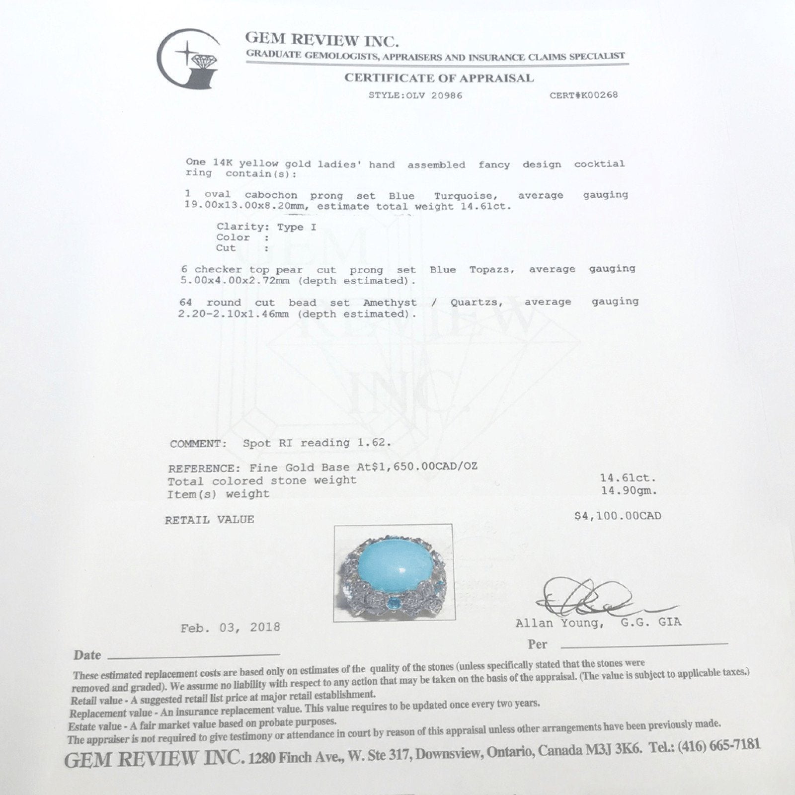 Turquoise, Blue Topazs and Amethysts Cocktail Ring in14 kt Yellow Gold; Oval Shape Cabochon Turquoise, Approximately 14.61ct; Size 7 1/4; Comes with Gem Review Appraisal