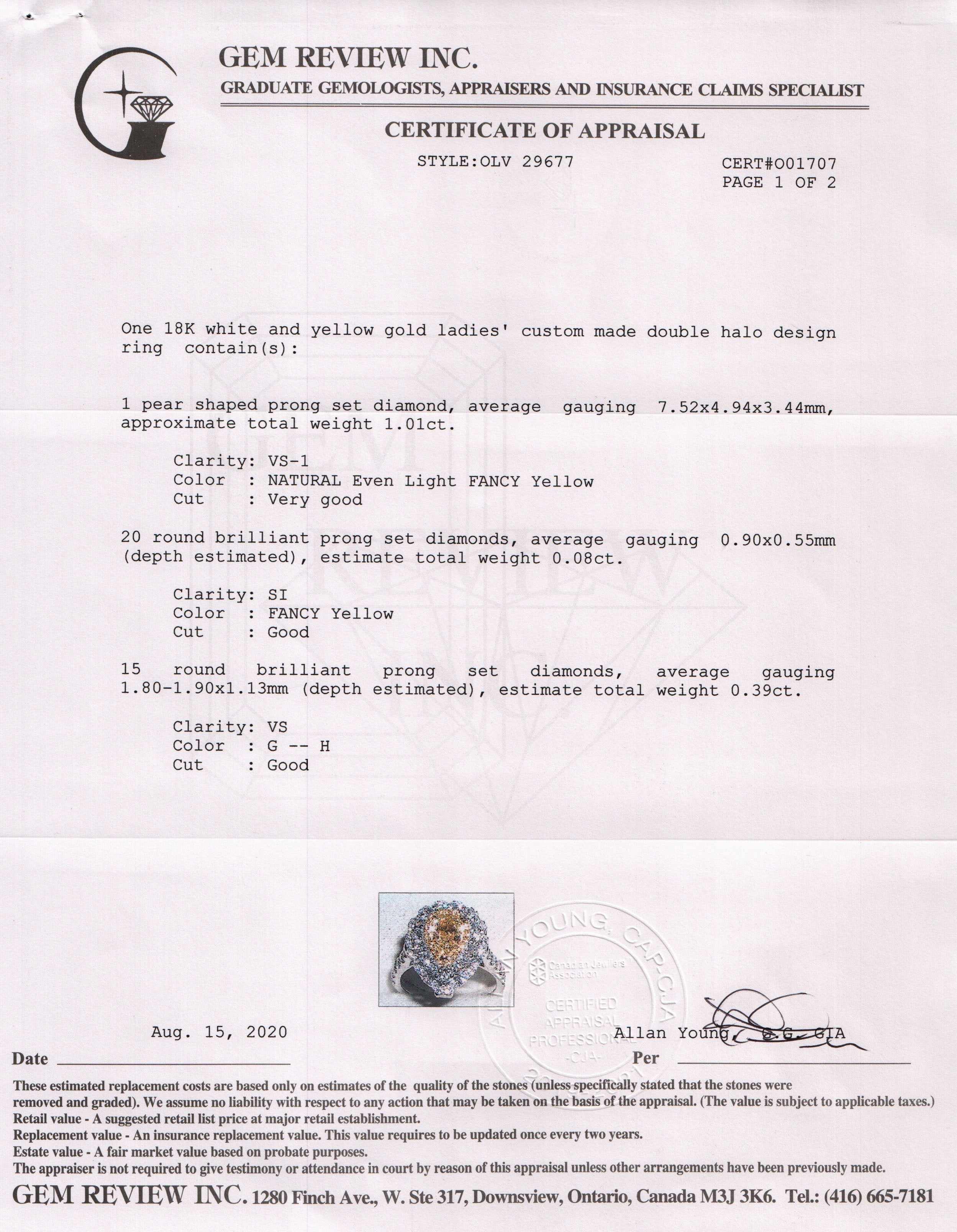 - 1 Pear Shaped Yellow Diamond Weighing Approximately 1.01 ct. of VS1 Clarity, Natural Even Light Fancy Yellow Colour, Very Good Cut