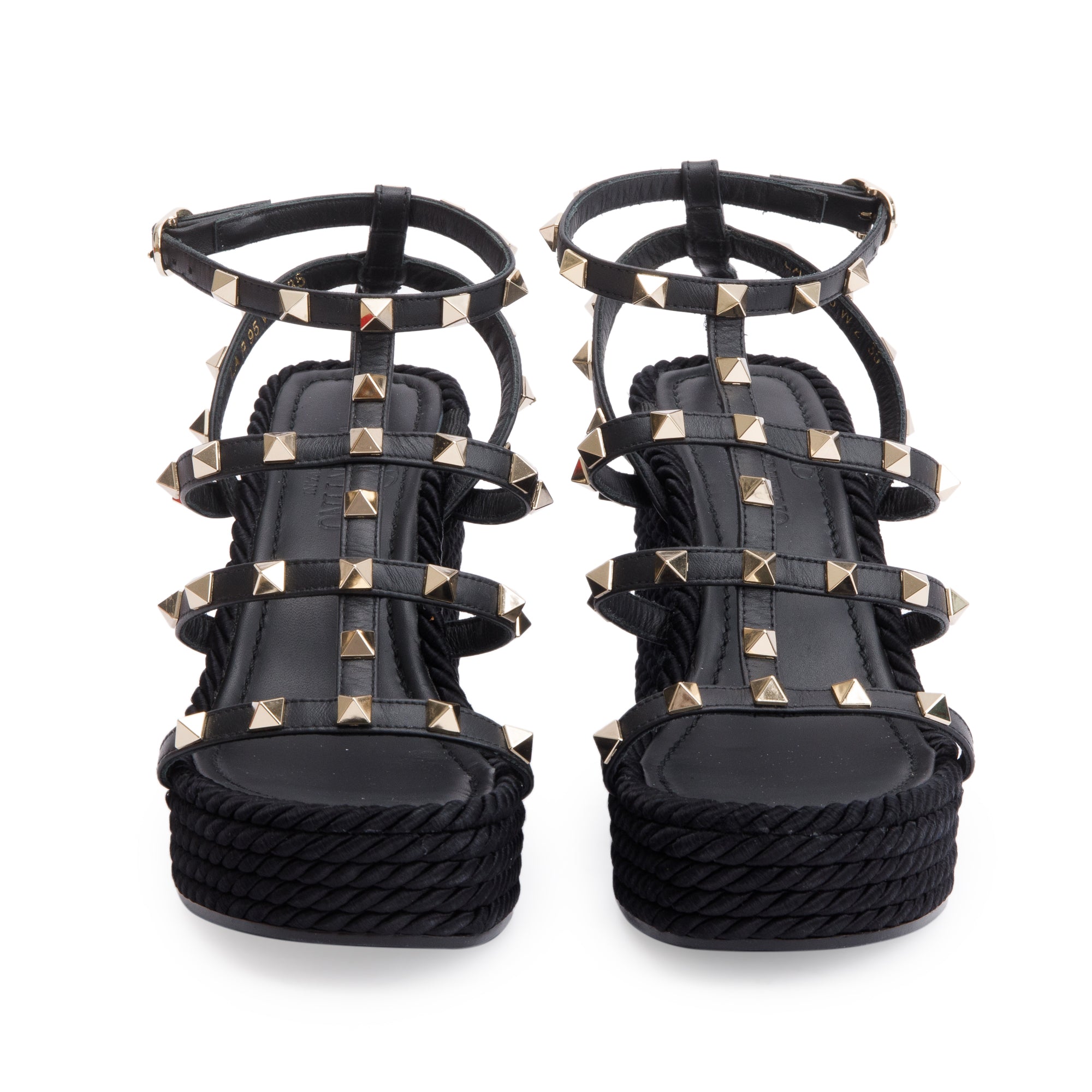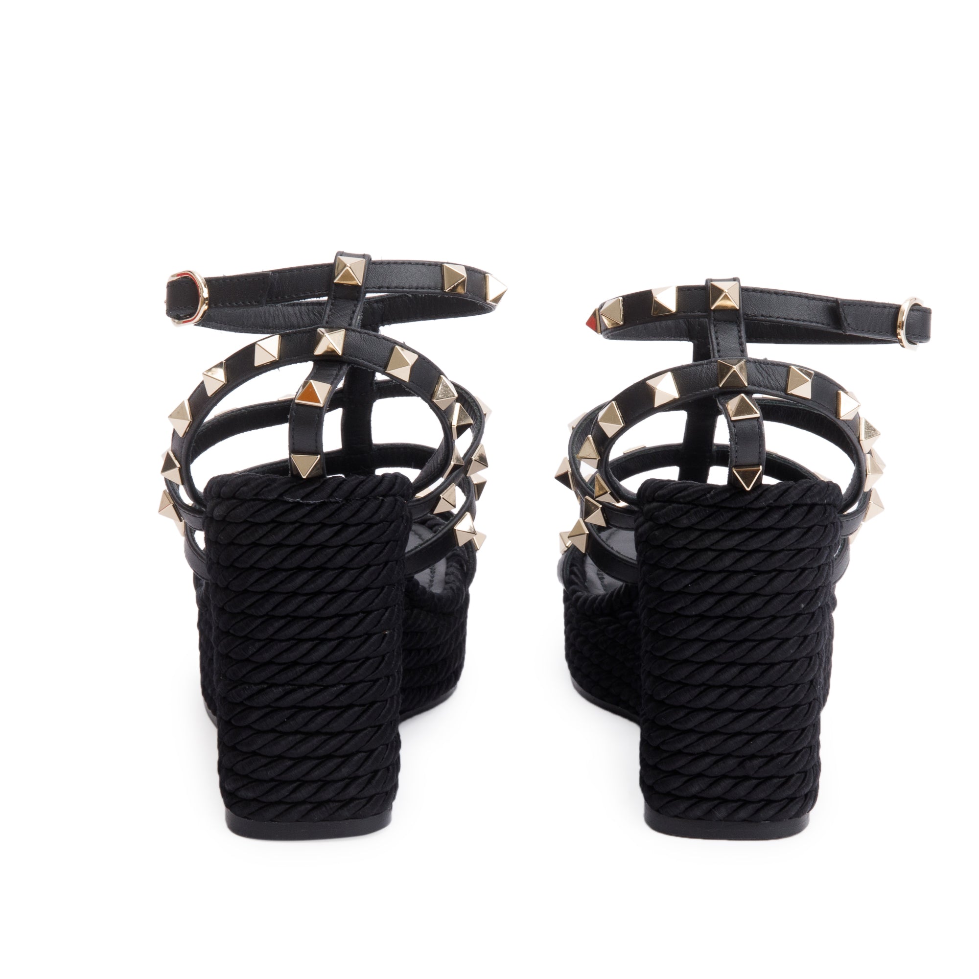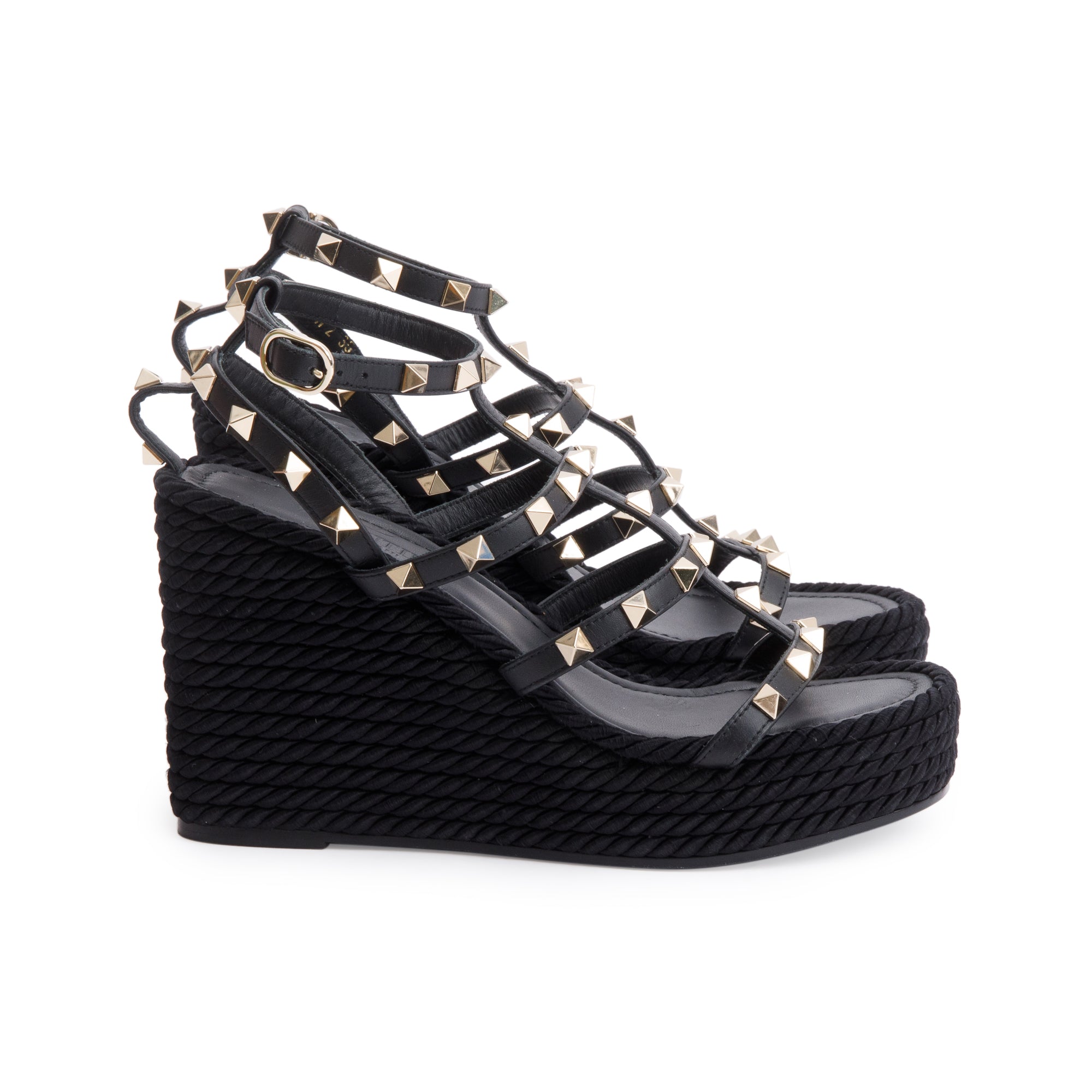 Black Calfskin Rockstud Ankle Strap Wedge Sandals, Size 35