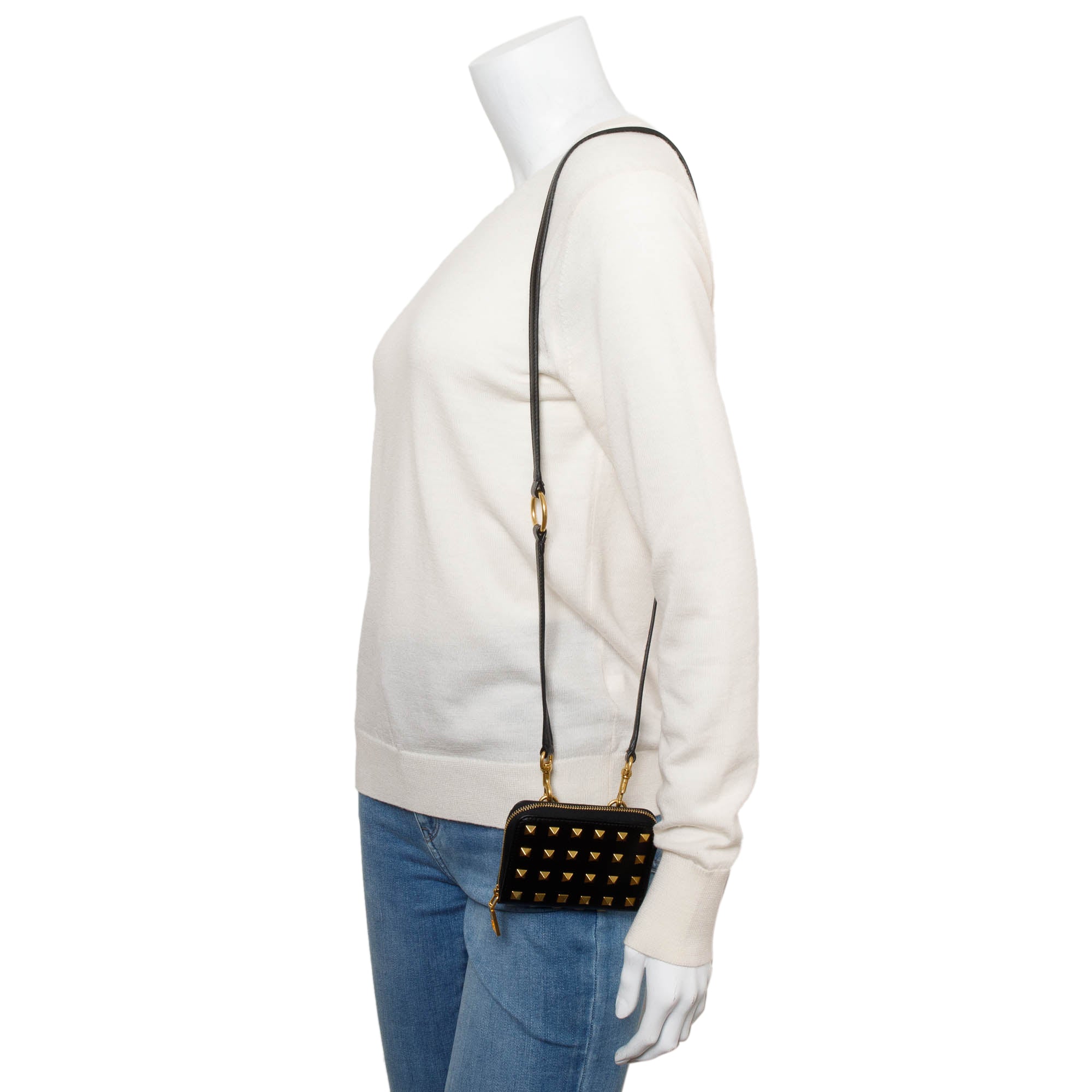Black Leather Rockstud Spike Zip Around Card Holder Wallet w/ Strap