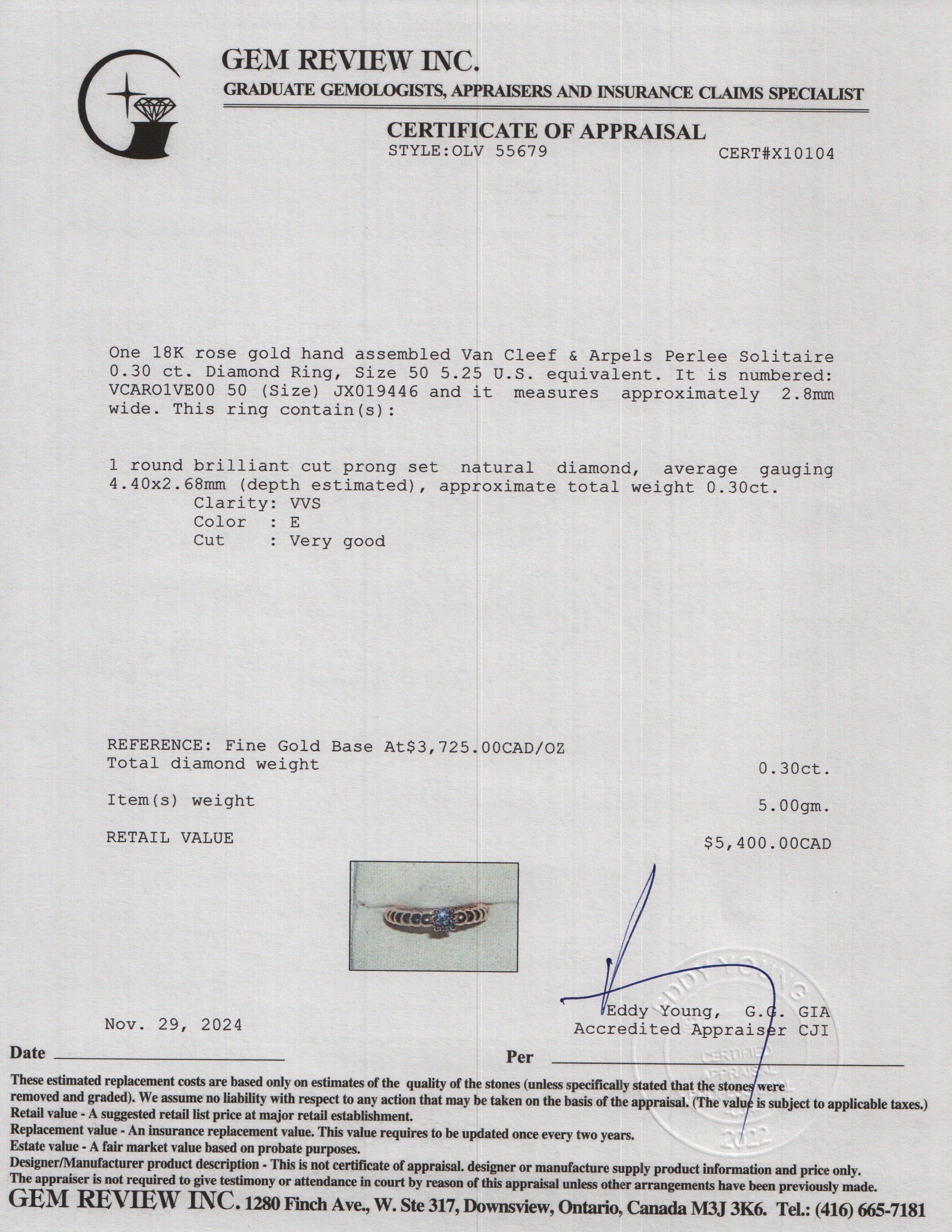 18k Rose Gold Perlee Solitaire 0.30 ct. Diamond Ring, Size 50 5.25 w/ Box, Certificate & Receipt