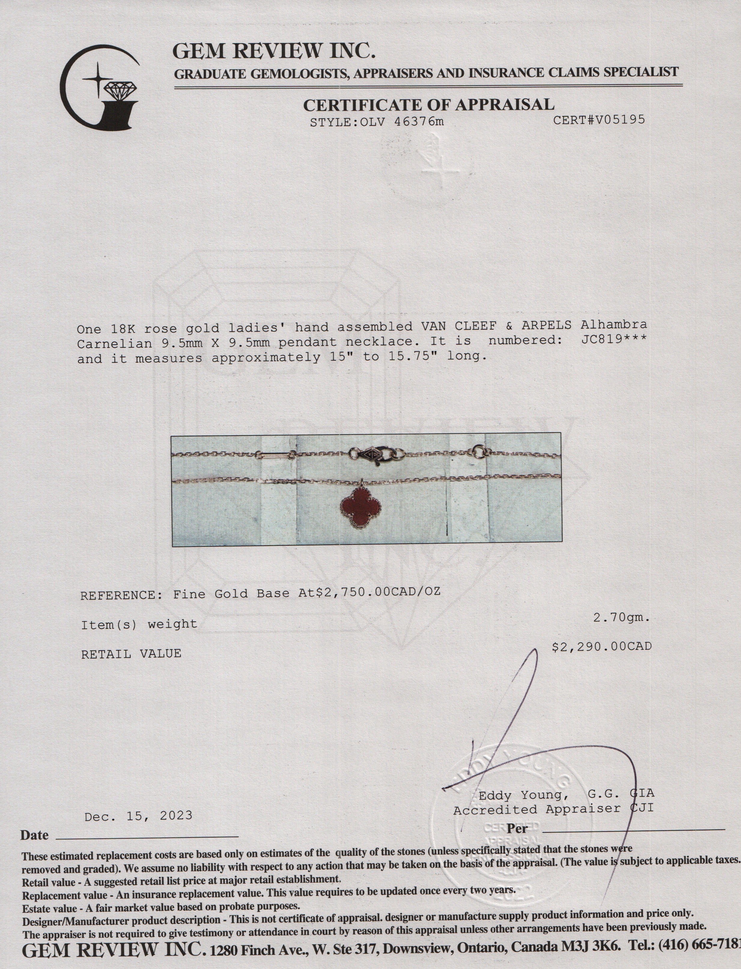 18k Rose Gold Sweet Alhambra Carnelian Pendant Necklace w/ Box, Receipt & Certificate
