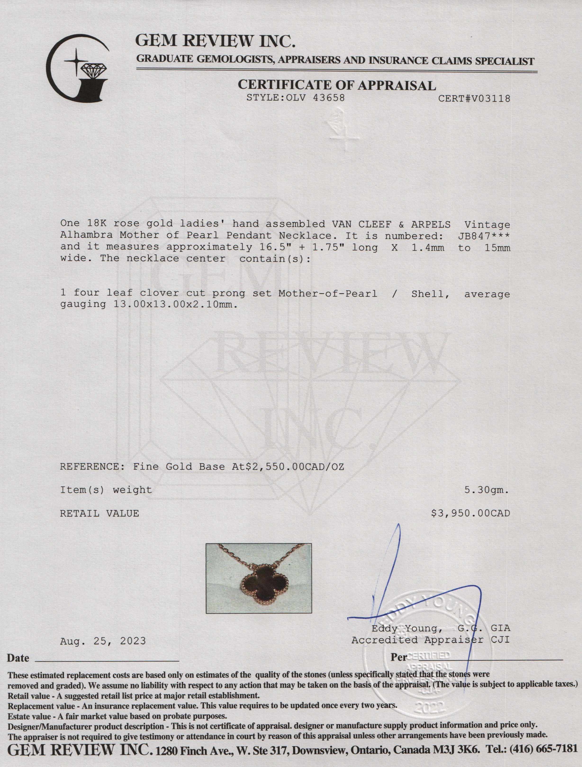 18k Rose Gold Vintage Alhambra Mother of Pearl Pendant Necklace w/ Box & Certificate