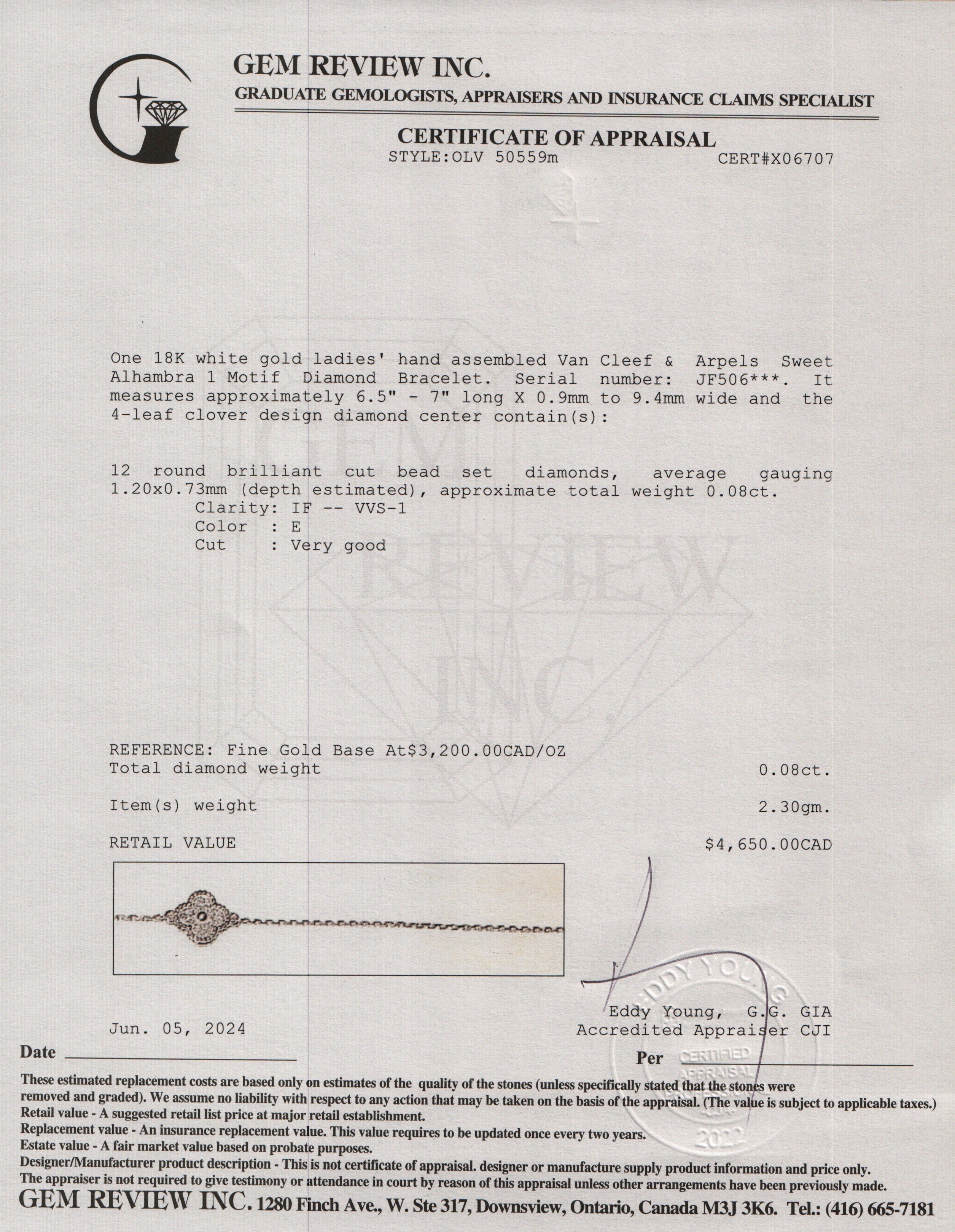 18k White Gold Sweet Alhambra 1 Motif Diamond Bracelet w/ Box & Receipt