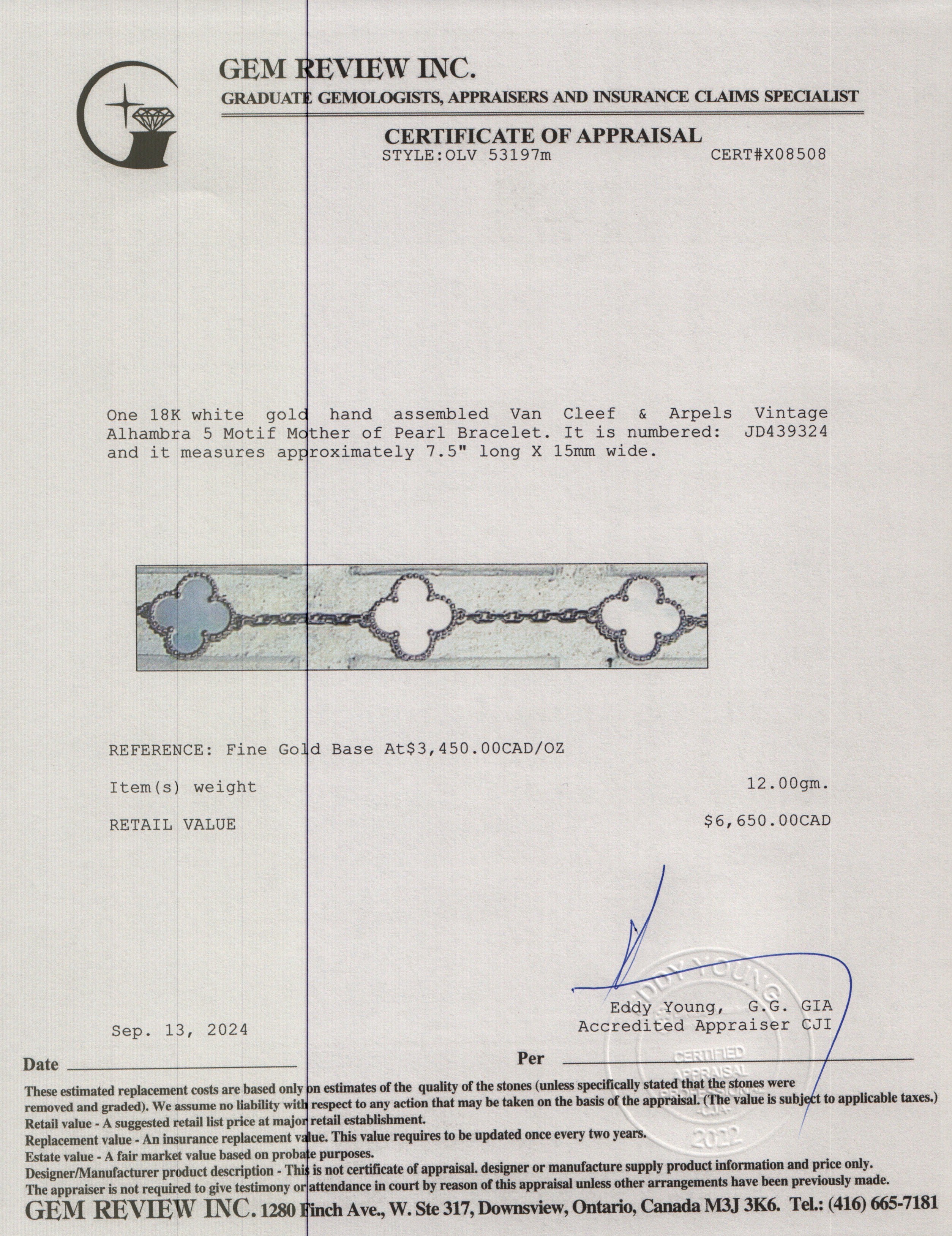 18k White Gold Vintage Alhambra 5 Motif Mother of Pearl Bracelet