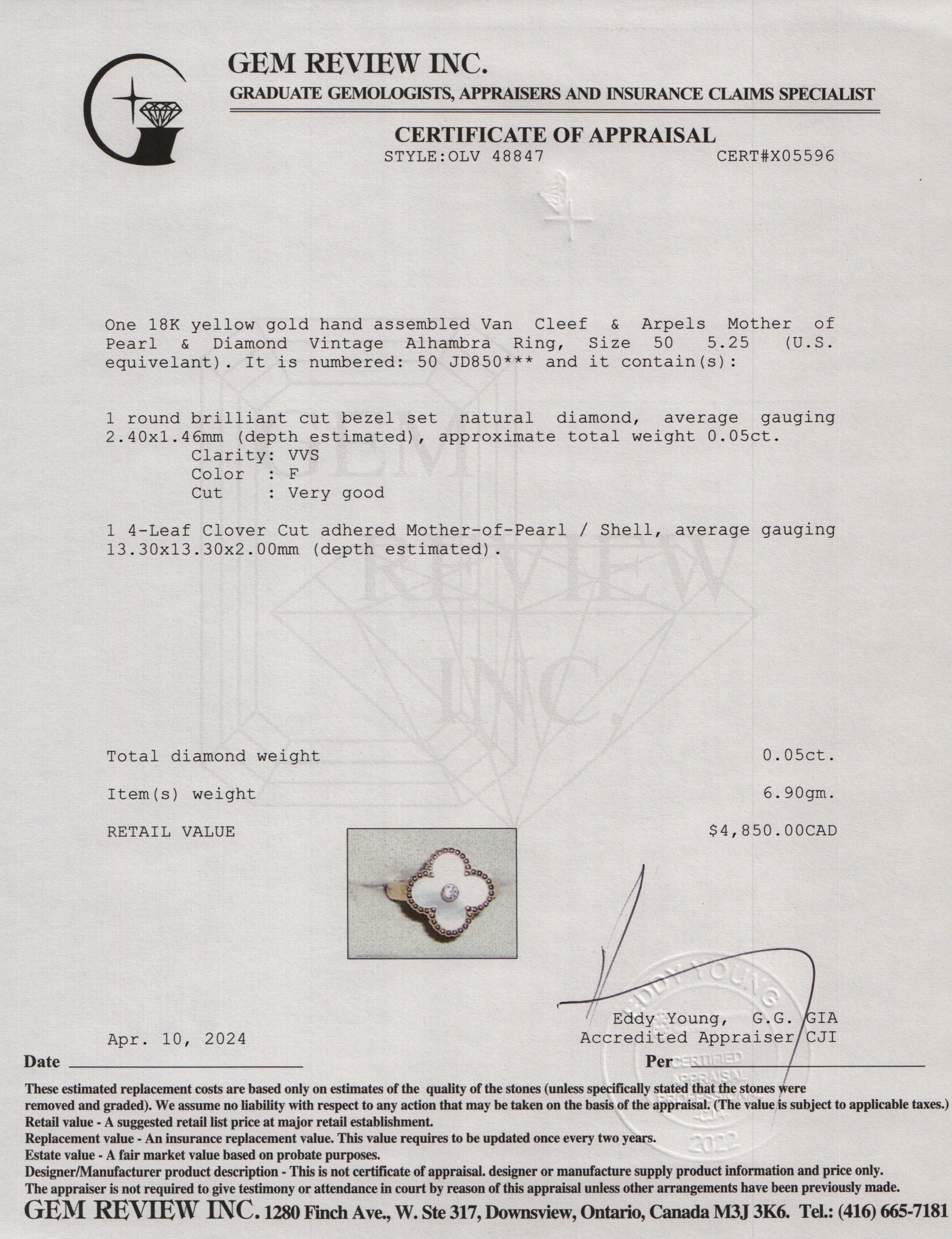18k Yellow Gold Mother of Pearl & Diamond Vintage Alhambra Ring, Size 50 5.25 w/ Box