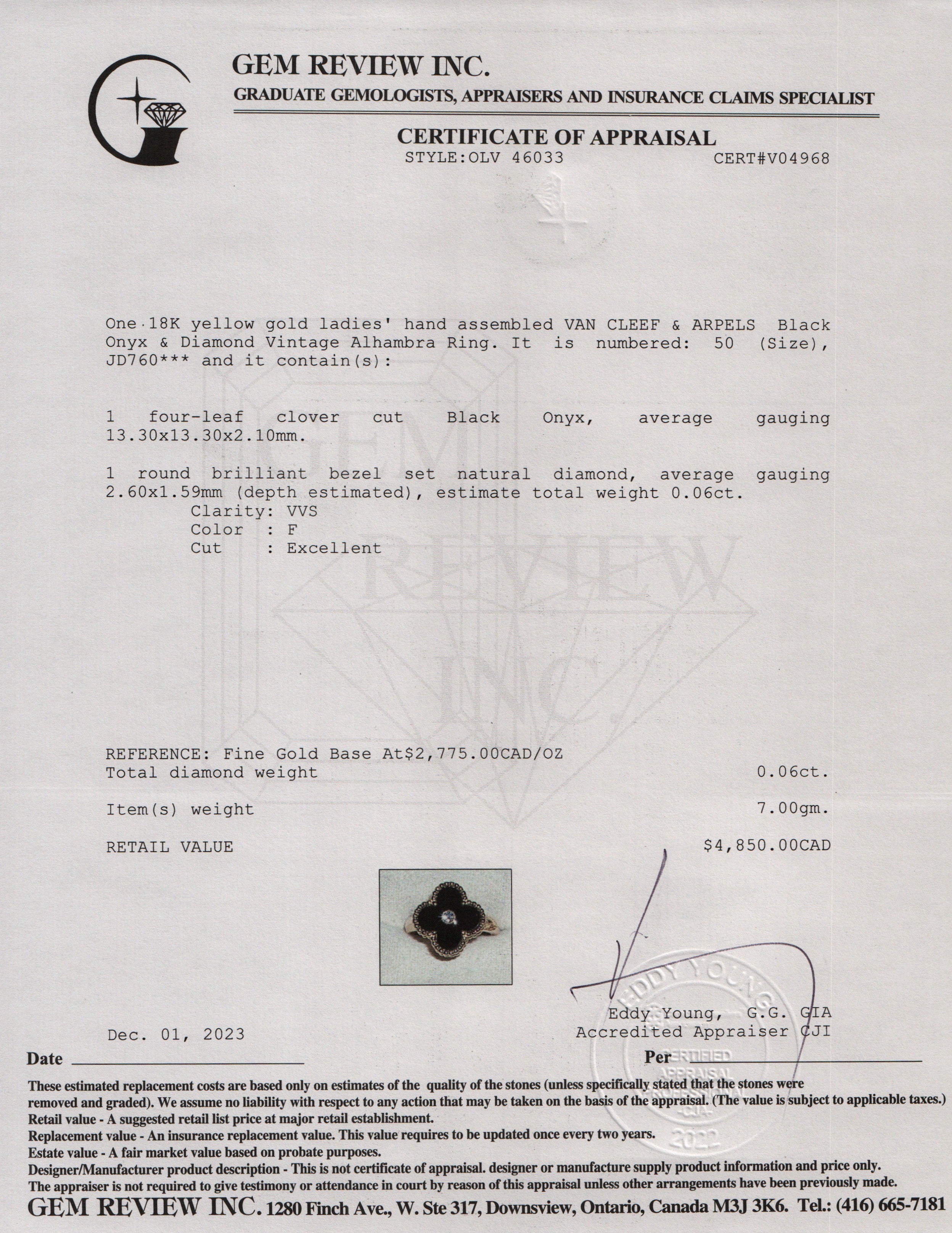 18k Yellow Gold Onyx & Diamond Vintage Alhambra Ring, Size 50 5.25 w/ Box, Certificate & Receipt