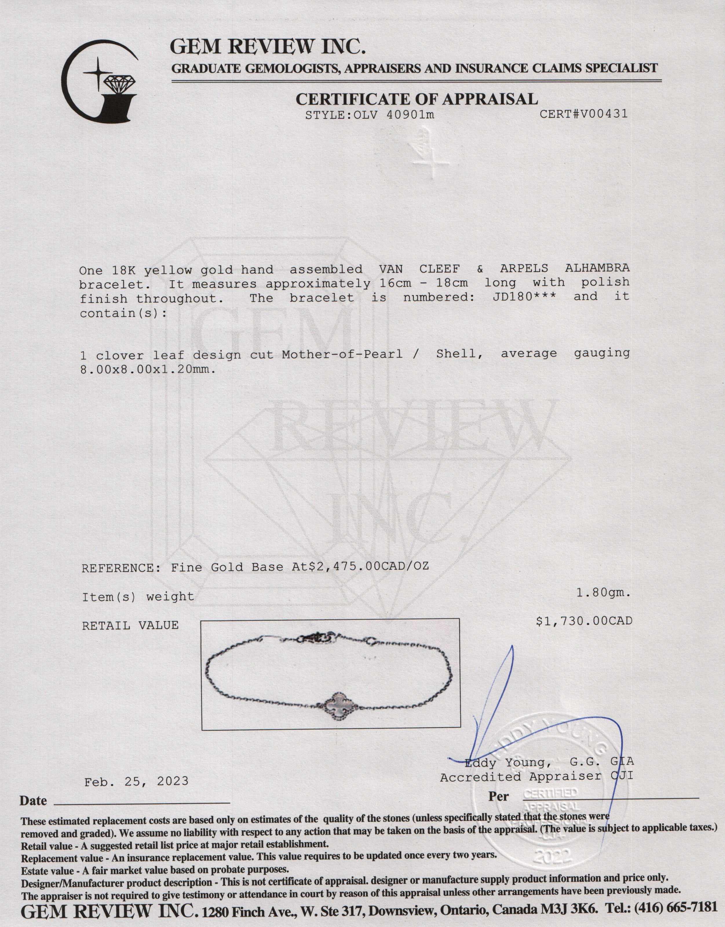 18k Yellow Gold Sweet Alhambra Mother of Pearl Bracelet w/ Box