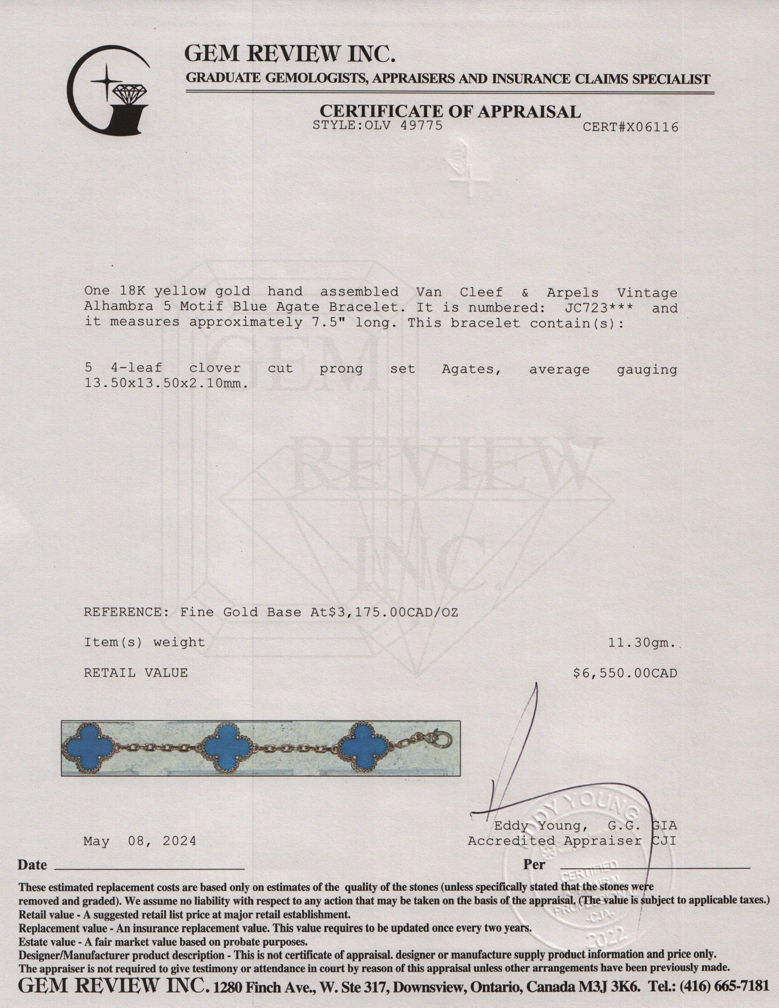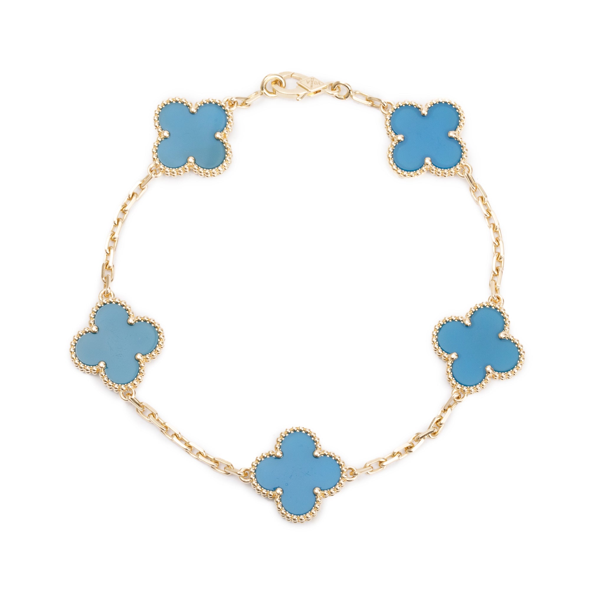 18k Yellow Gold Vintage Alhambra 5 Motif Blue Agate Bracelet