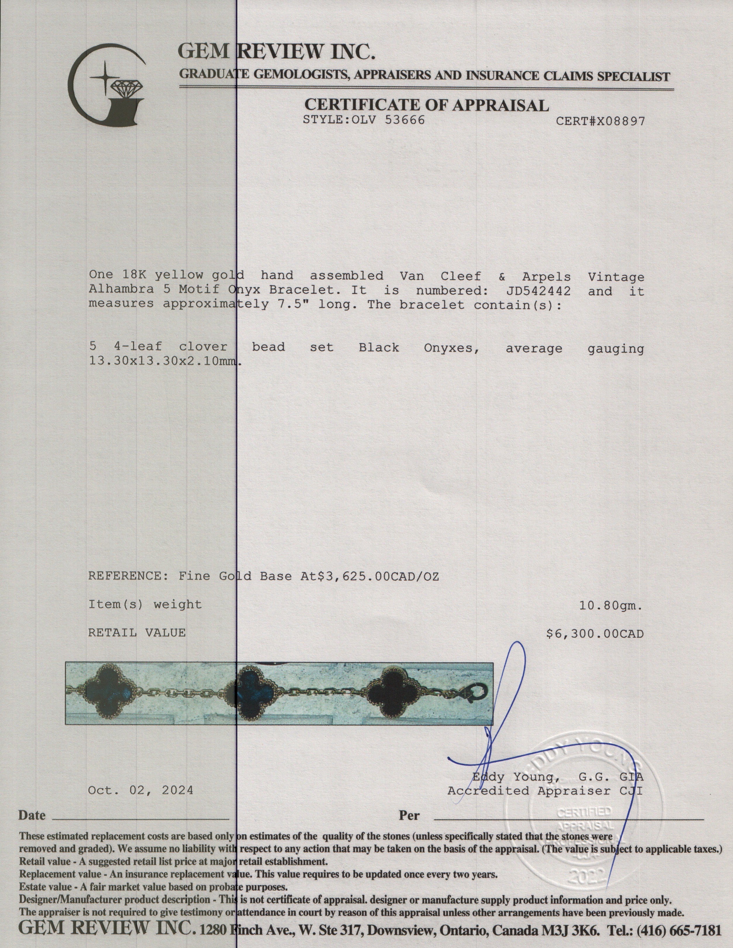 18k Yellow Gold Vintage Alhambra 5 Motif Onyx Bracelet w/ Box