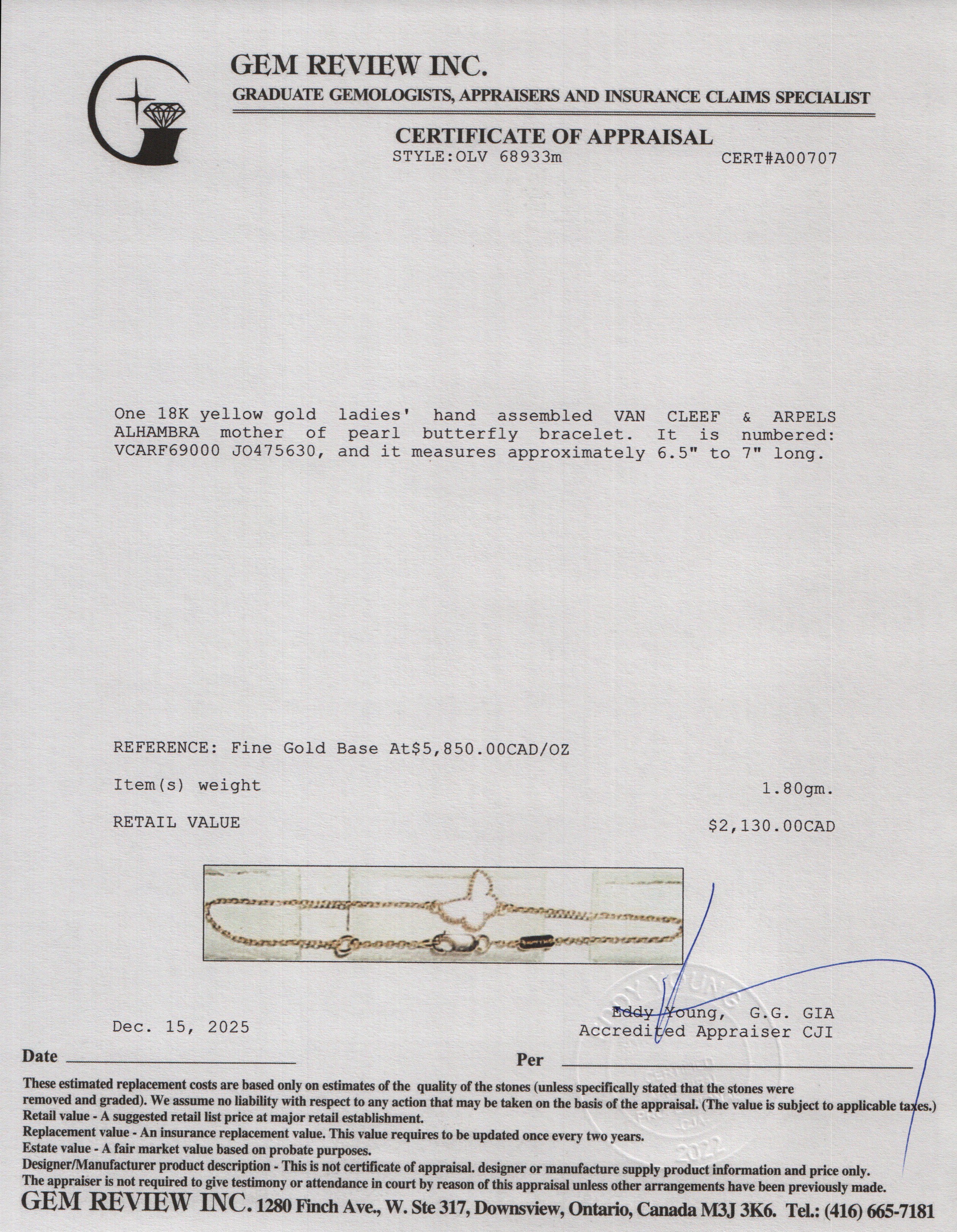 2025 18k Yellow Gold Mother of Pearl Sweet Butterflies Bracelet w/ Box & Certificate