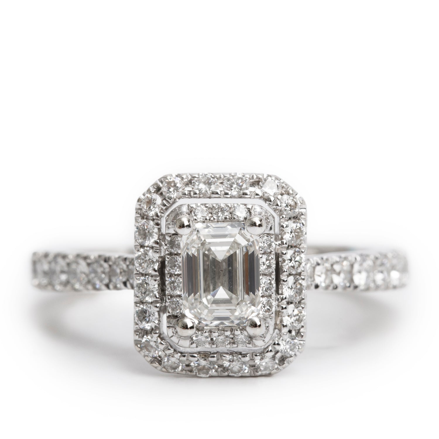 14k White Gold Love Emerald Cut Diamond Engagement Ring, Size 6.25 w/ Box & Certificate