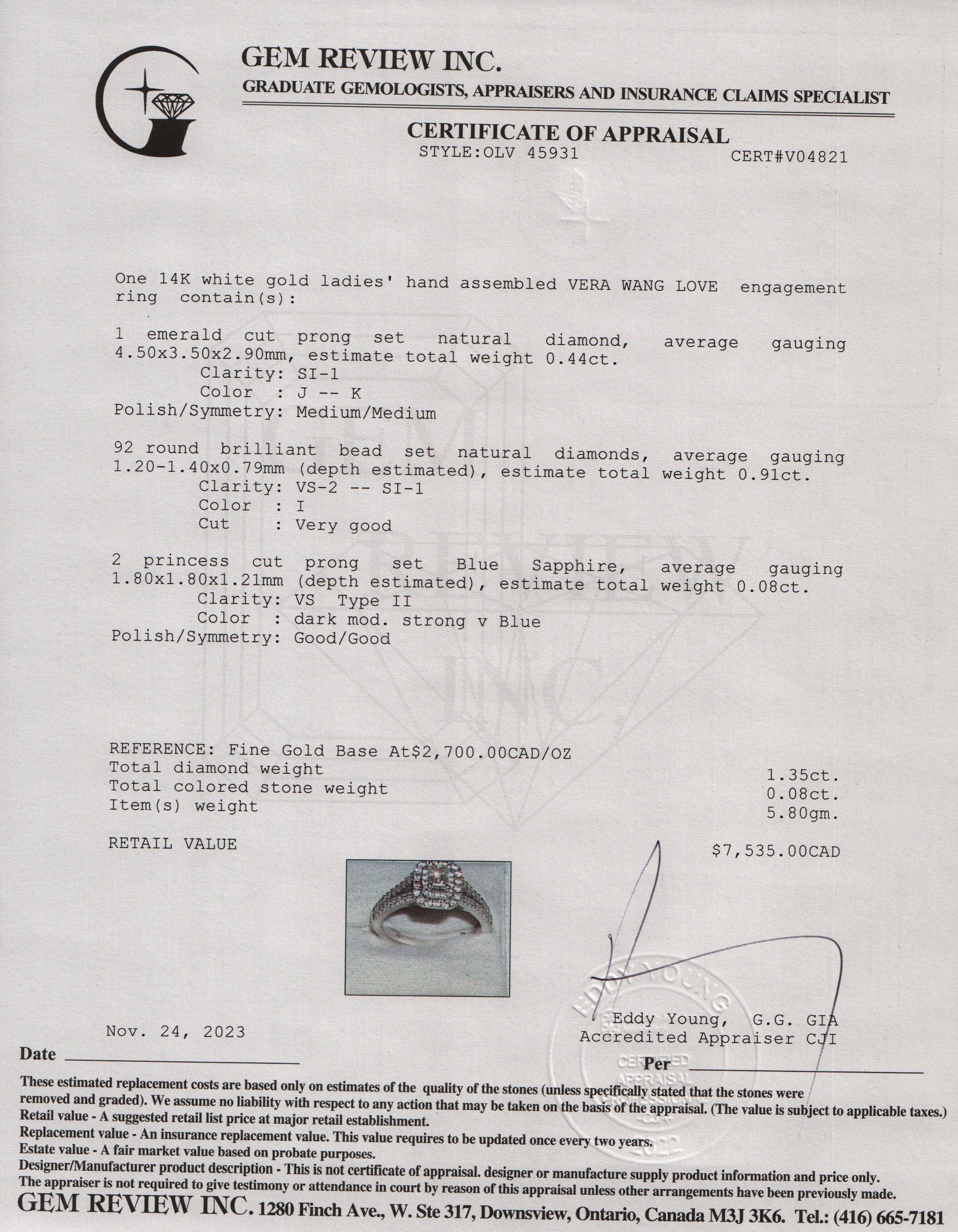 14k White Gold Love Emerald Cut Diamond Engagement Ring, Size 8.75
