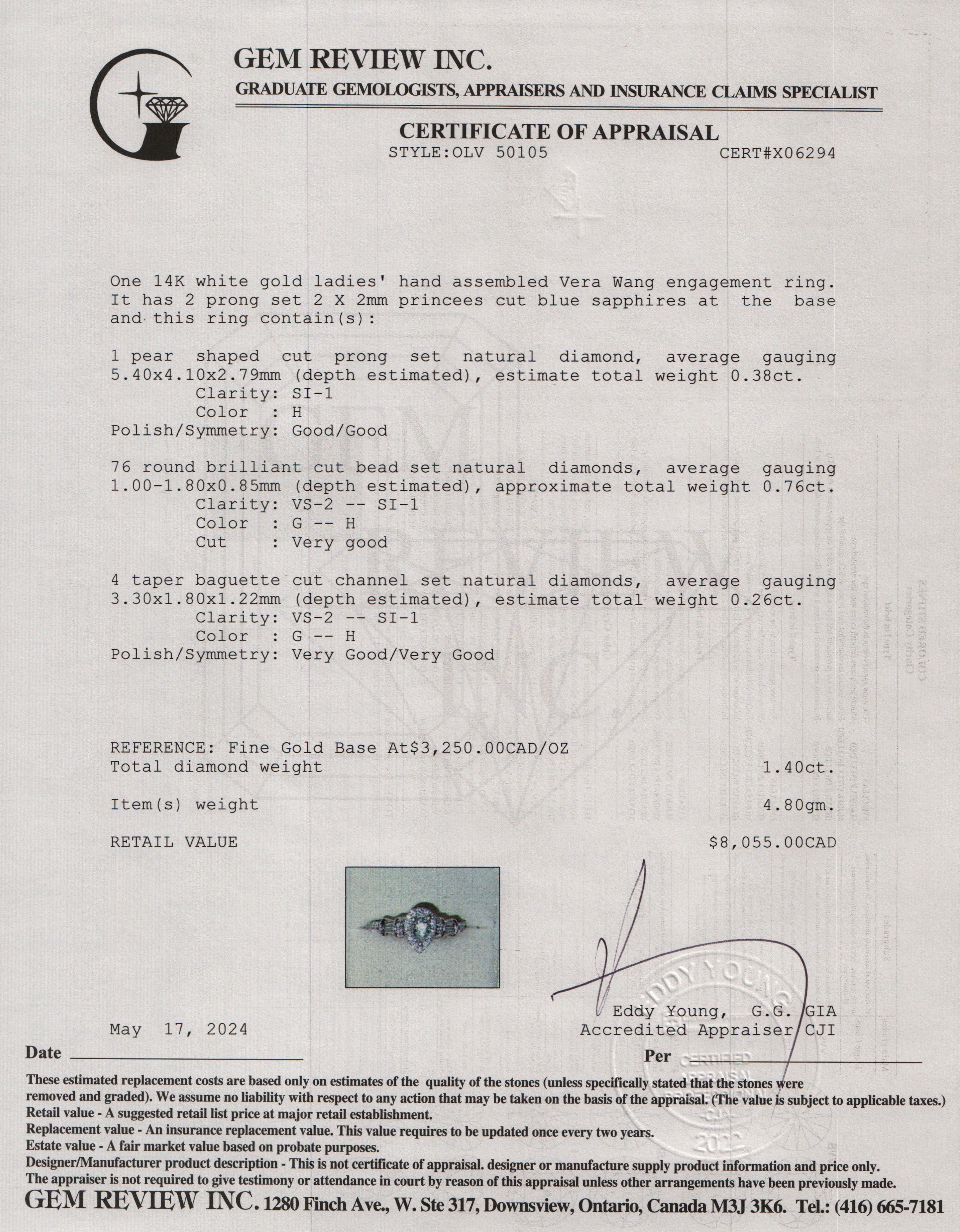 14k White Gold Love Pear Shaped Cut Diamond Engagement Ring, Size 6.5 w/ Box