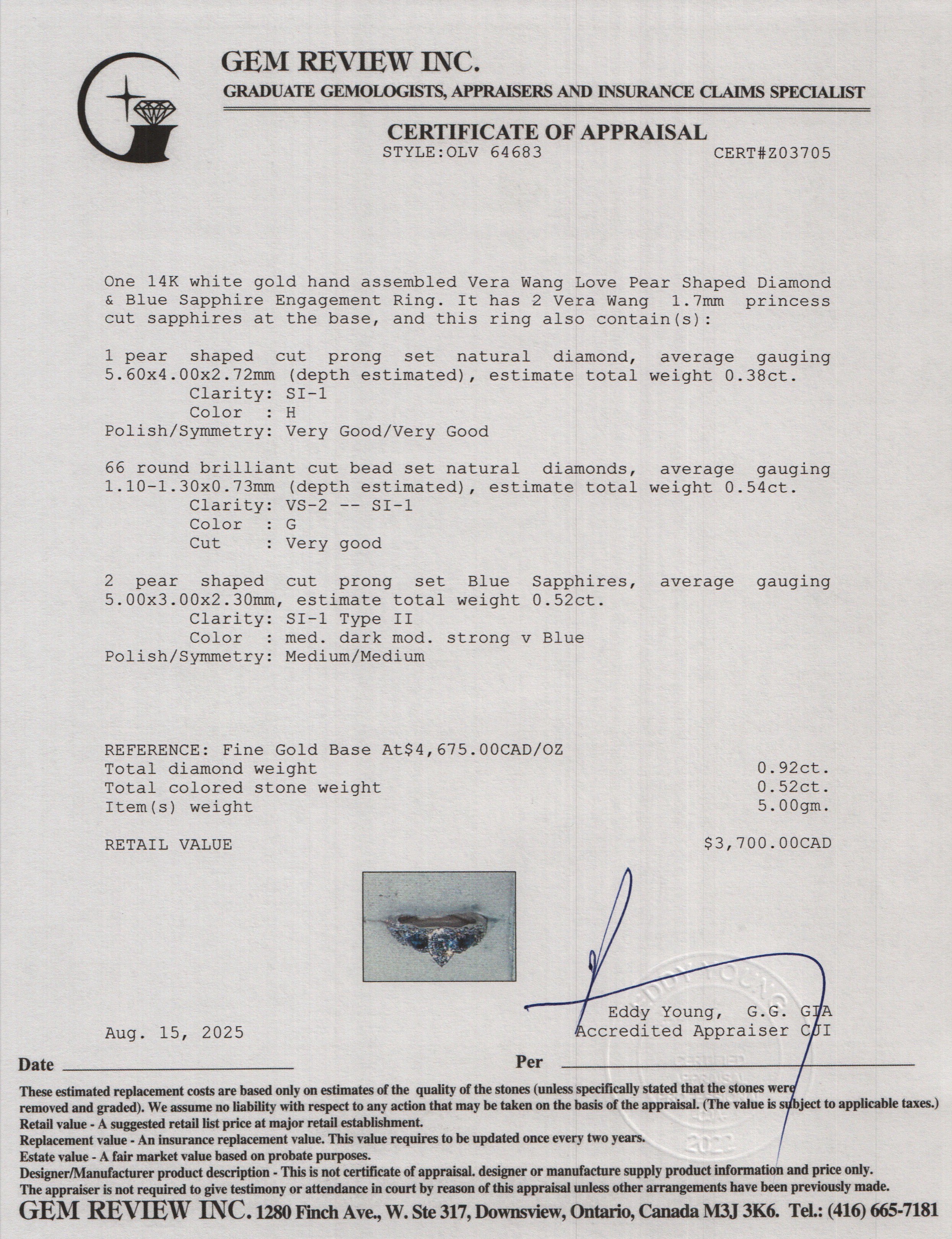 14k White Gold Love Pear Shaped Diamond & Blue Sapphire Engagement Ring, Size 6.25