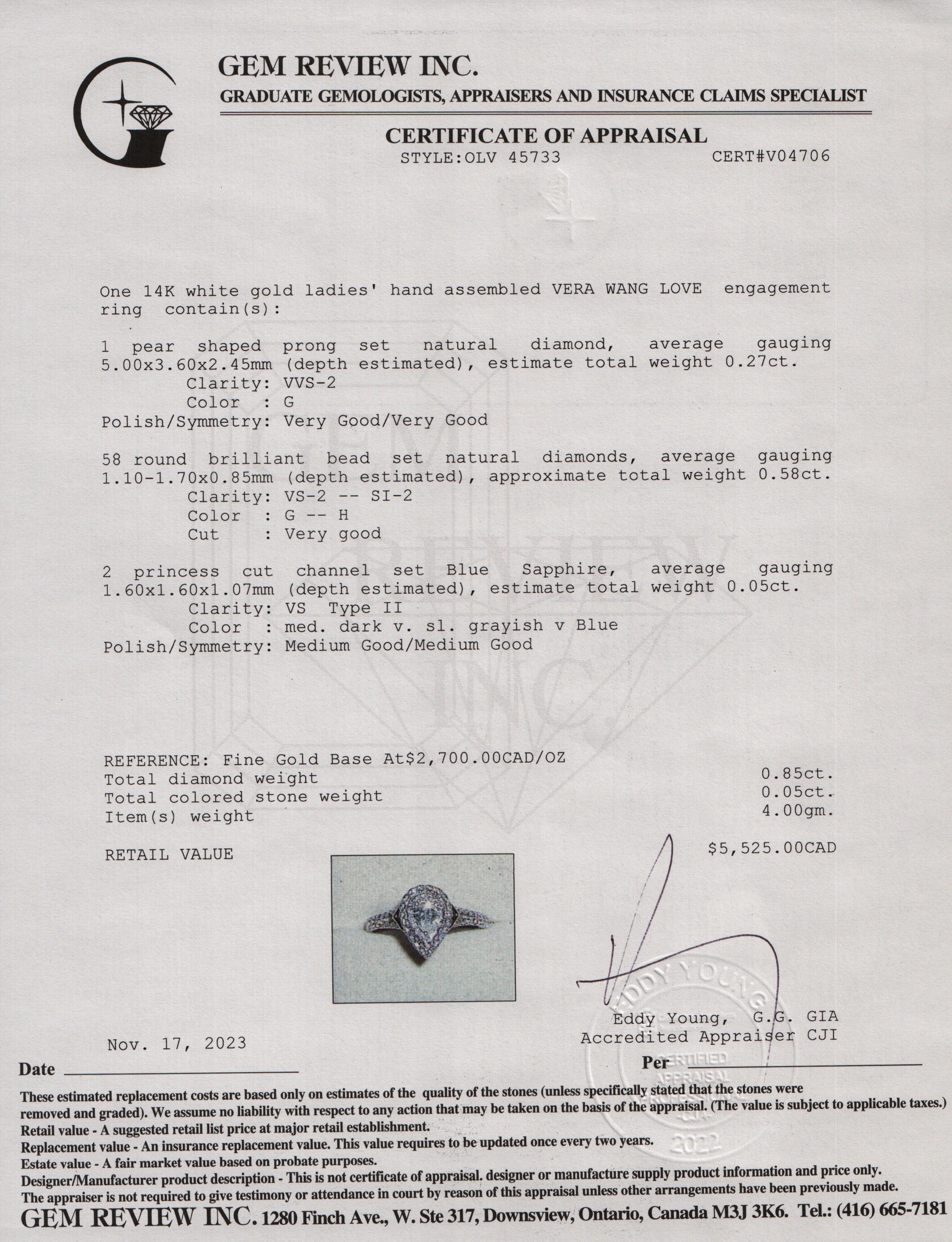 14k White Gold Love Pear Shaped Diamond Engagement Ring, Size 6.75 w/ Box