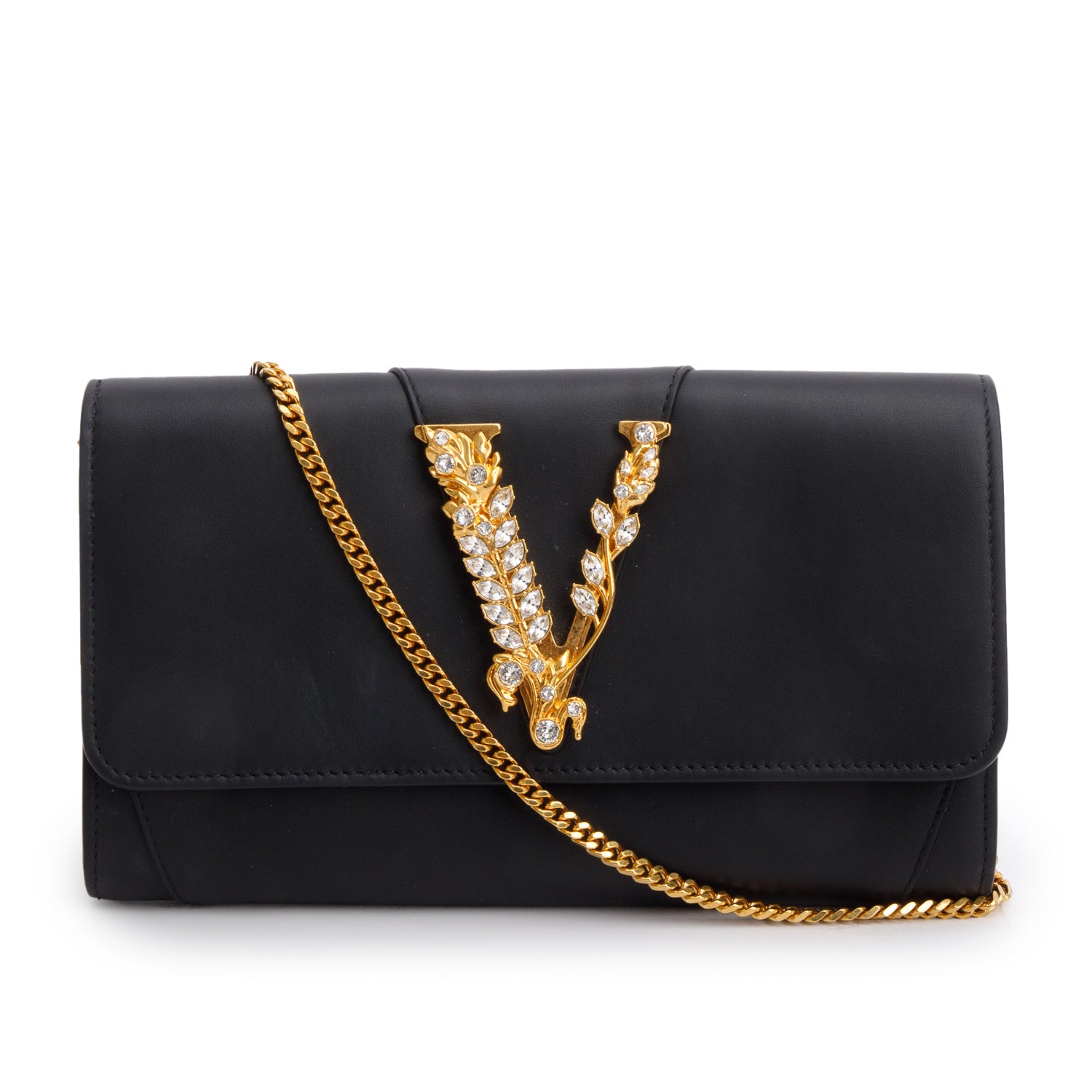 Black Lambskin Virtus Crystal Embellished Wallet on Chain