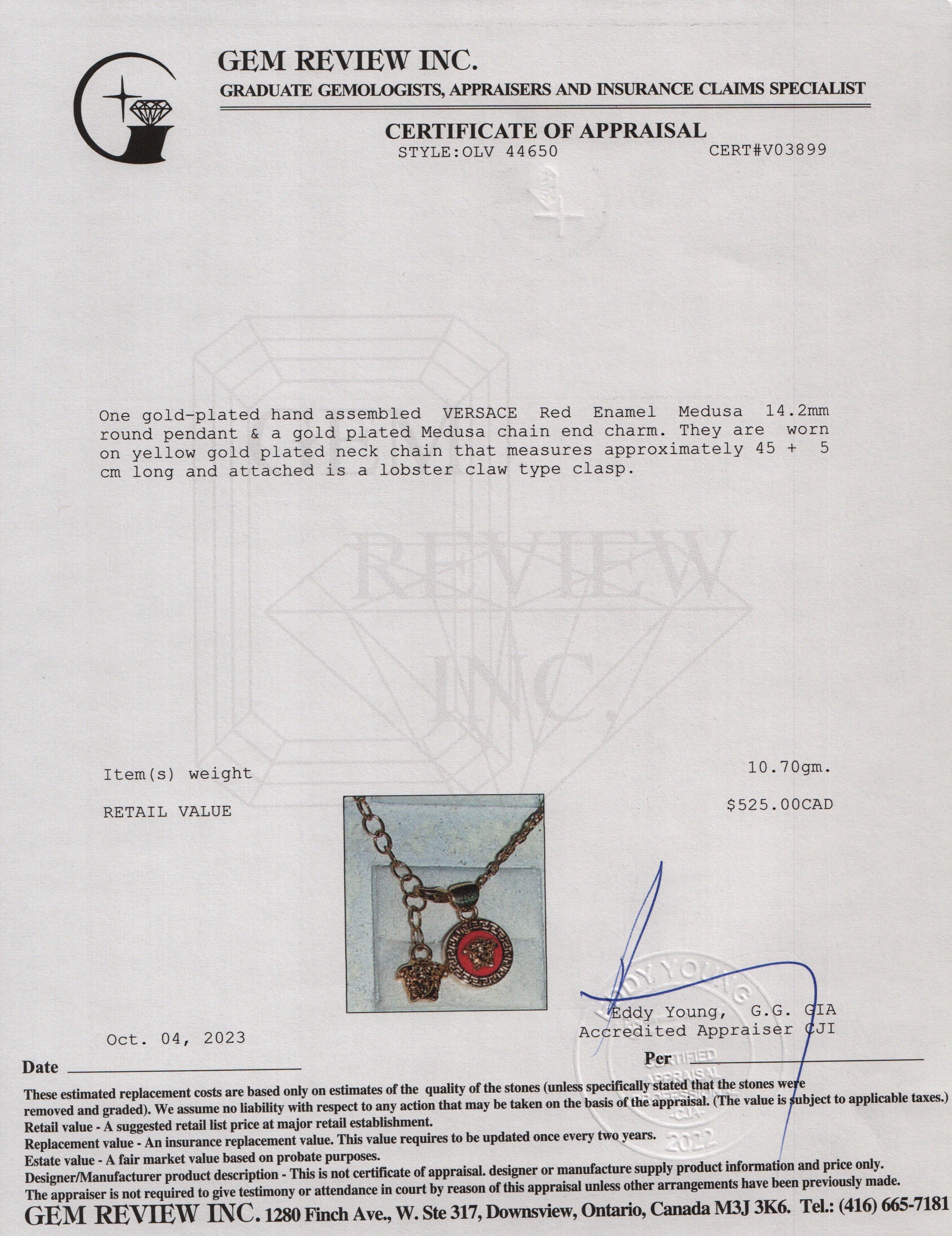 Gold Plated Red Enamel Medusa Pendant Necklace w/ Box
